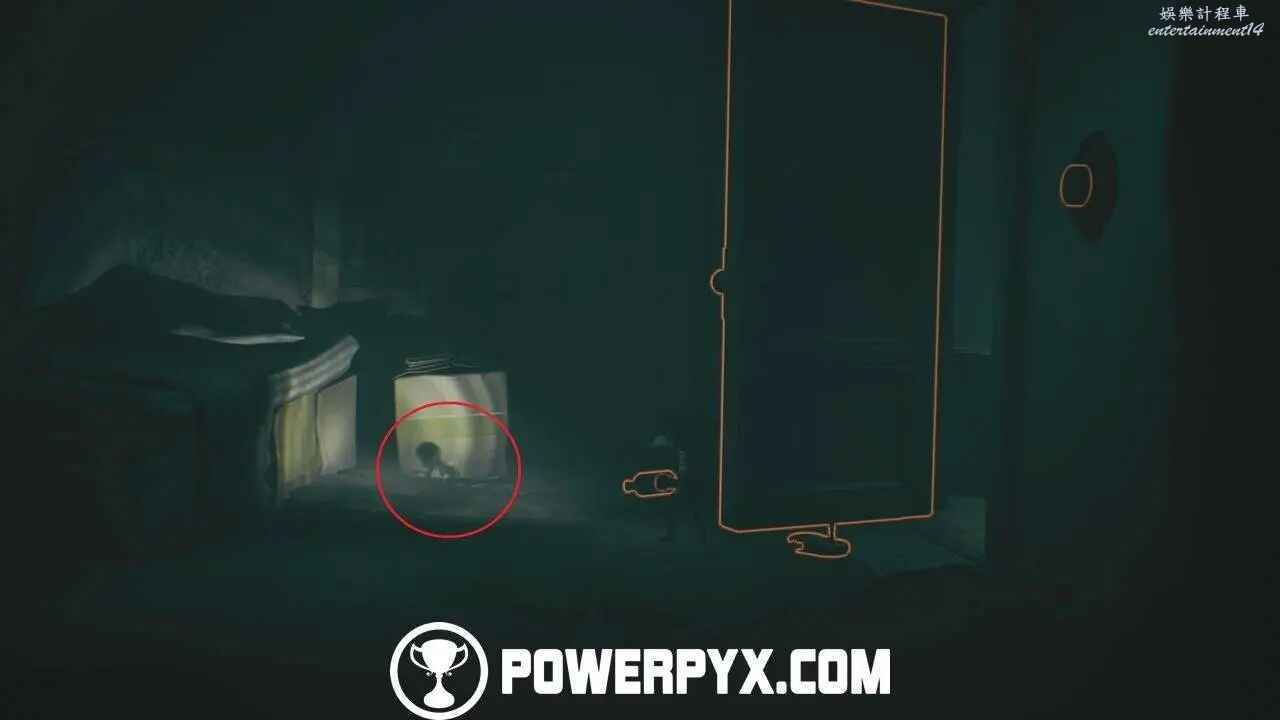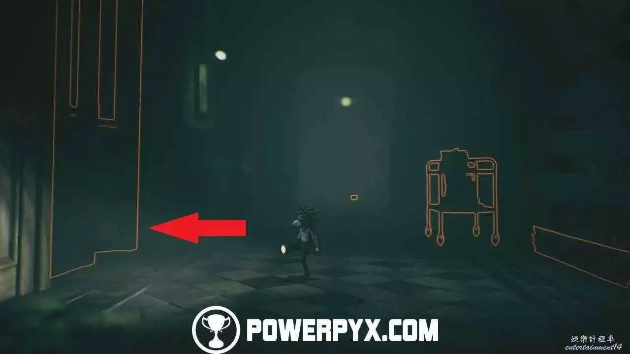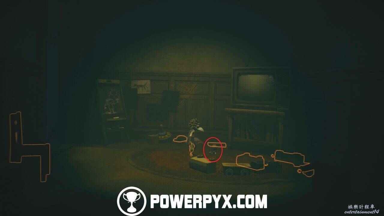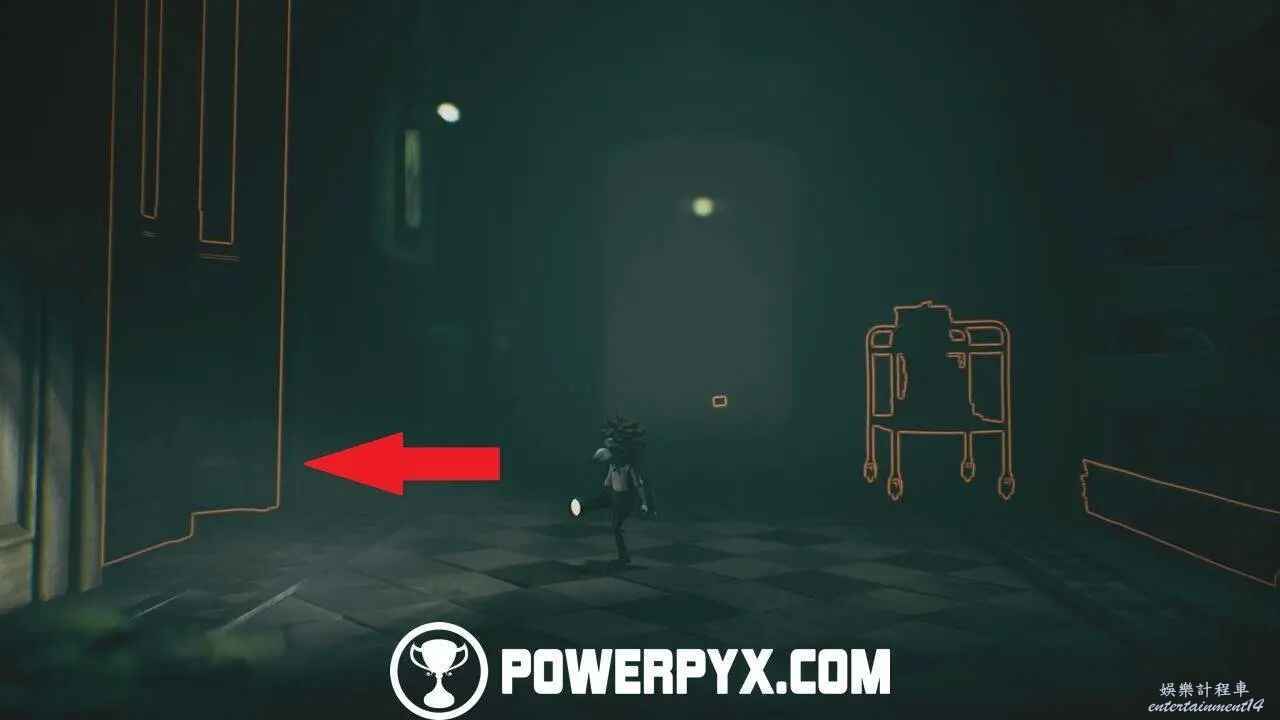 進入建築物後不久會遇到一塊需要拉下的木板,不要拉木板。先進入左側的門,來到第二個房間找到玩偶。