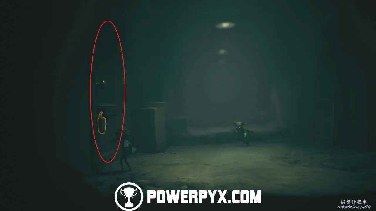 在第二次被BOSS的手追逐後不久來到一扇需要通過拉杆打開的門。在此之前,走到走廊的盡頭拾取玩偶。