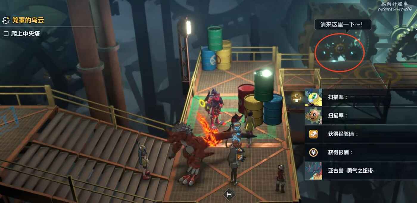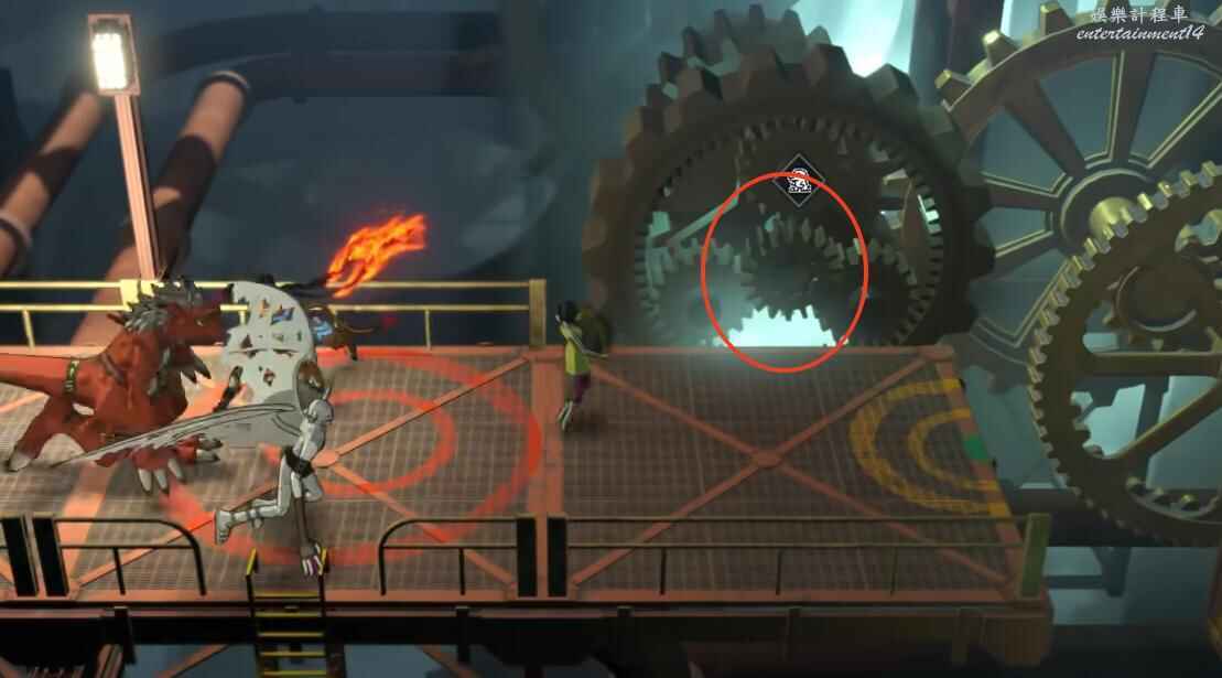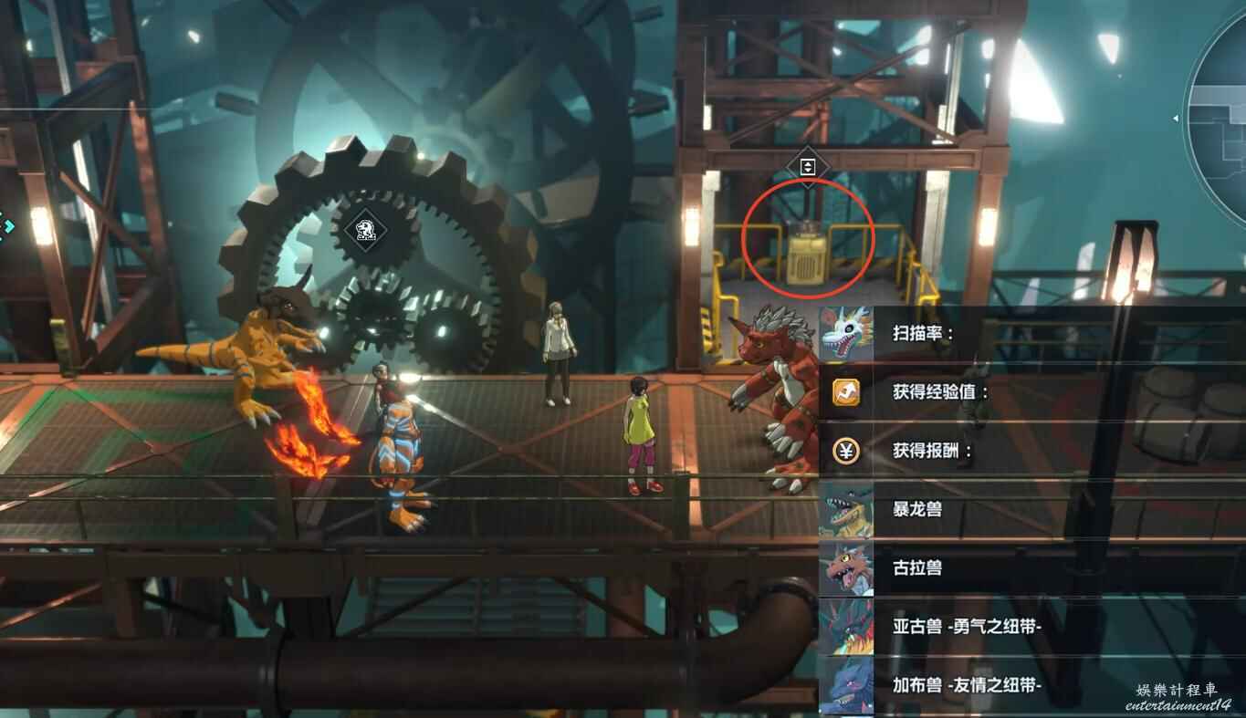 回去後,會提示我們使用電屬性“數碼攻擊”啟動小揪心蟲獸,它起來後可以幫助我們打開旁邊大門,然後提醒我們需要找到他的同伴,它們才能合力打開動力室的大門,然後我們進入大門。