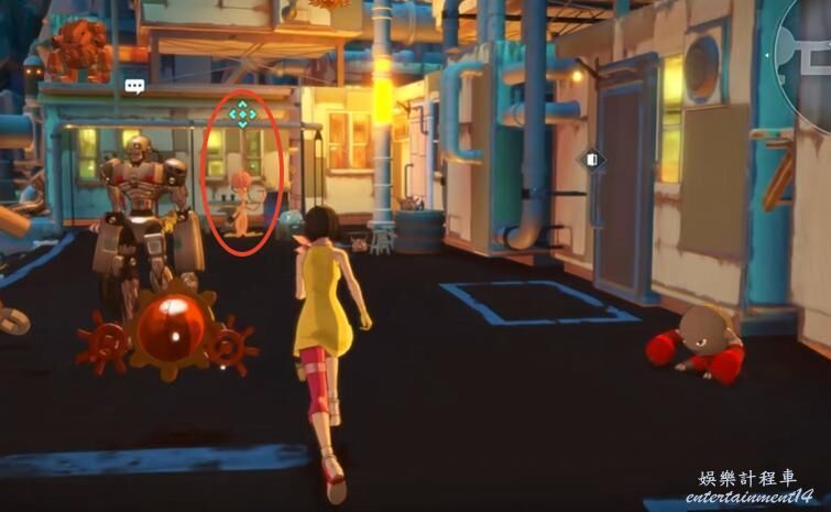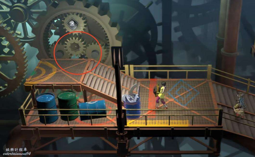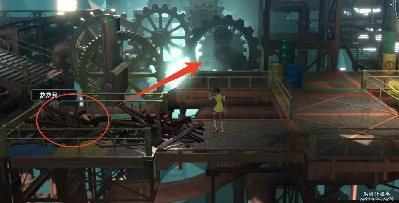 進入新區域先上樓梯然後往左邊走打破障礙,解救齒輪獸。