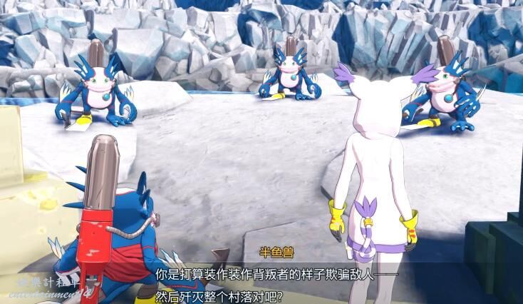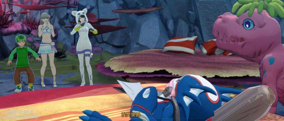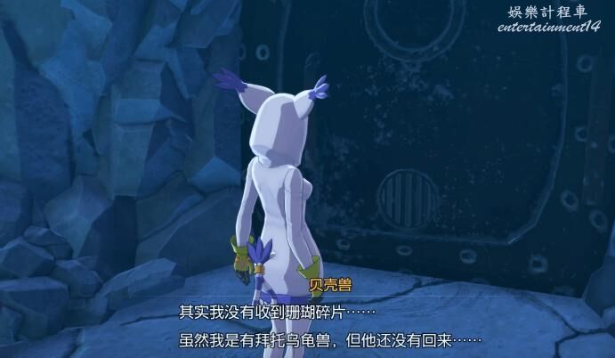 然後我們通過數碼攻擊攻擊它腳下的箱子,烏龜獸就下來了,烏龜獸交給我們珊瑚碎片,然後我們回去找貝殼獸。貝殼獸終於邀請我們進門,我們卻在屋子裡看到了一隻泰坦族。