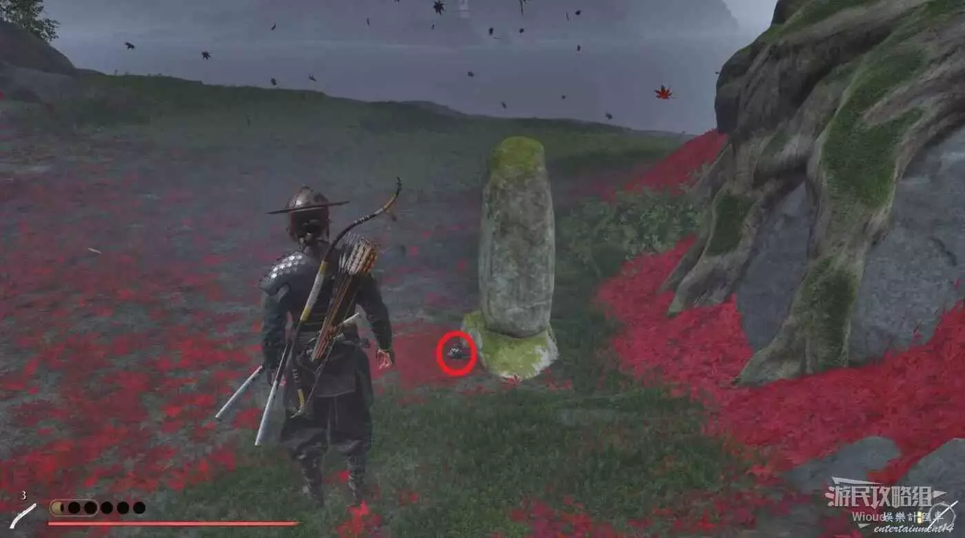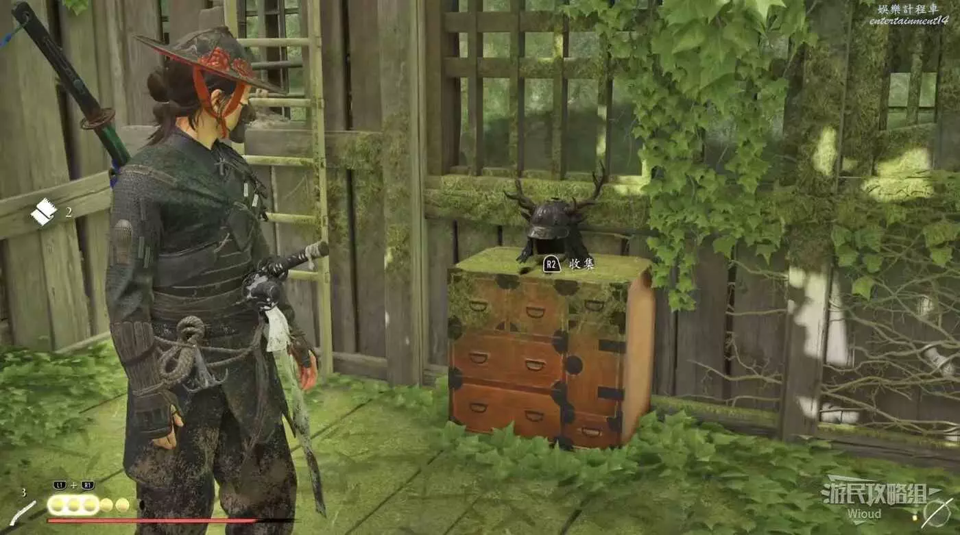 進入右側房屋拿【鹿角頭盔】,然後爬旁邊梯子到房頂,再跳到山壁的攀附節點上,往左走進入洞穴。