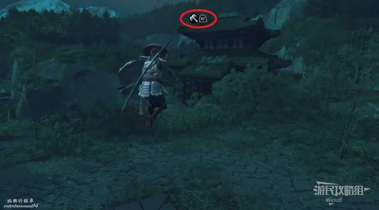 走到此處下方,往外跳一下,螢幕上方會出現使用鉤爪的提示,用鉤爪沿著白條逐級跳到樓頂。