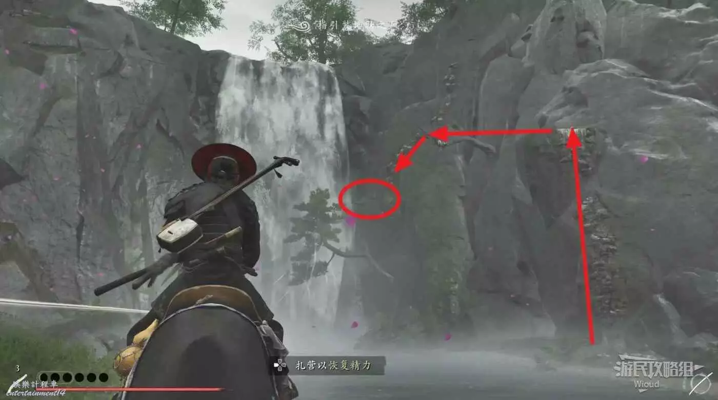 走到目的地瀑布旁,瀑布右側有個攀附點,沿著下圖路線跳到靠近瀑布的高台上。
