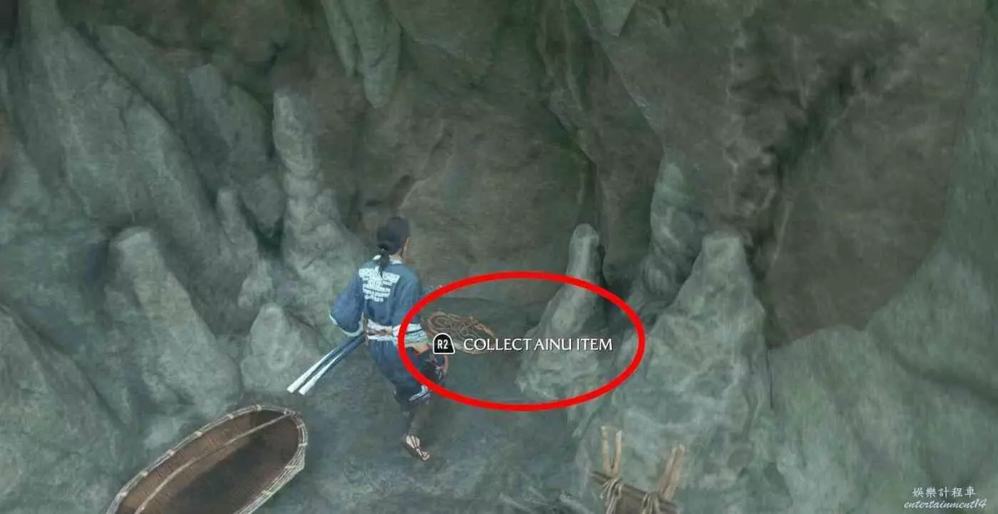 然後跟隨NPC到可攀爬岩壁處,任務目標就是拿到這阿伊努物品,無需擔心會錯過。
