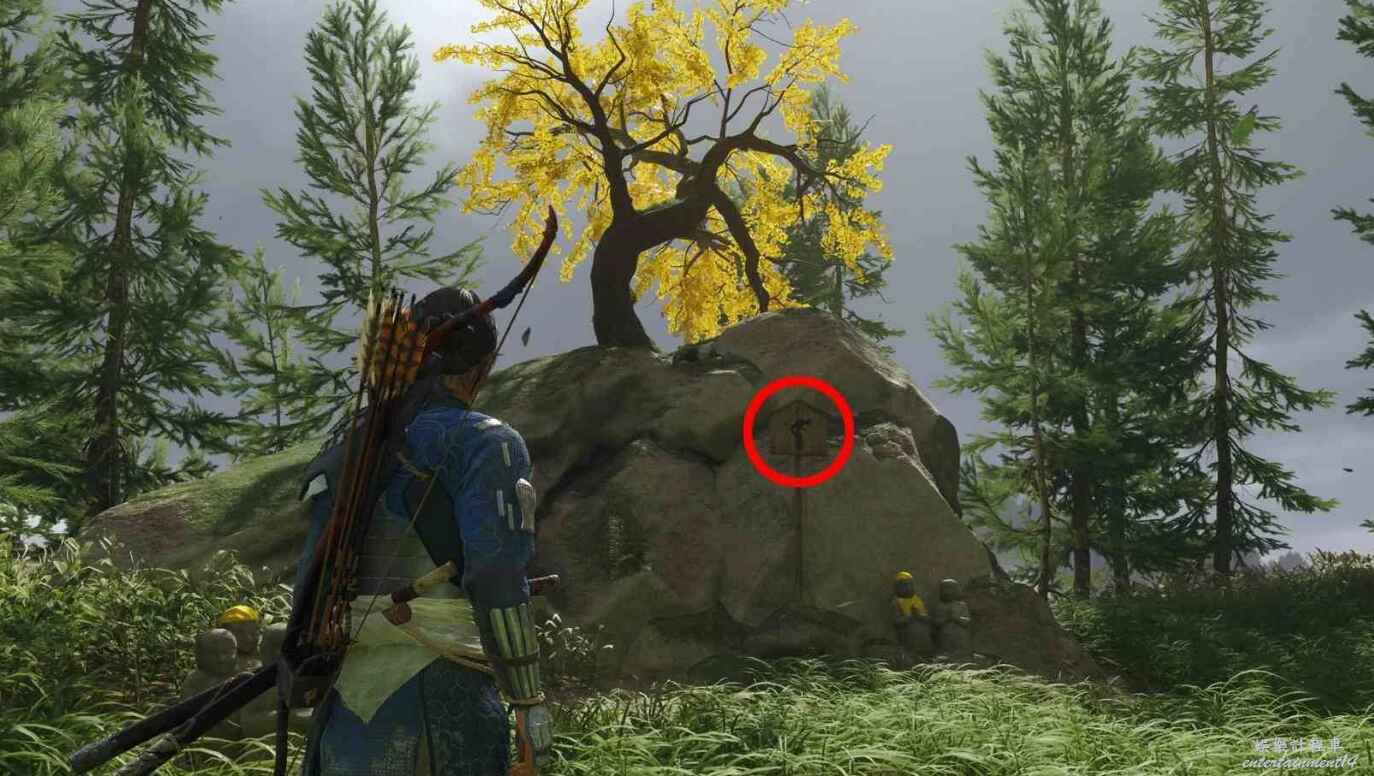 位於地圖上標記【靜思祭壇】圖示的位置,黃葉樹下的岩石之間。