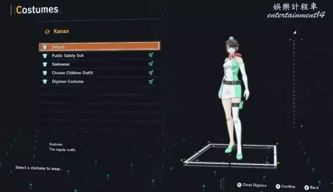 這裡有已解鎖的多種服裝供選擇,像默認服裝、公共安全制服、泳裝、被選兒童裝以及數碼寶貝主題服裝。