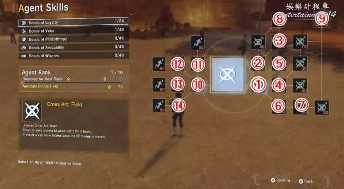 | 交叉藝術:靈氣 | 解鎖群體中量HP恢復+異常狀態/能力下降免疫技能 | 40 |