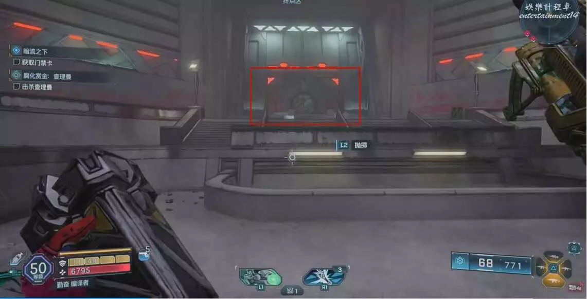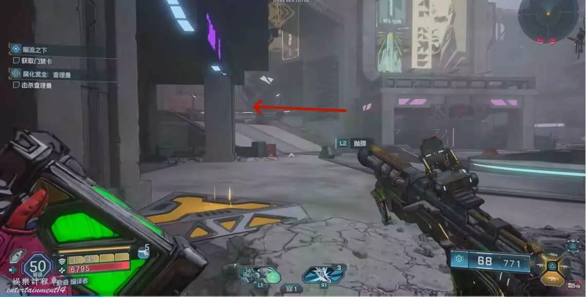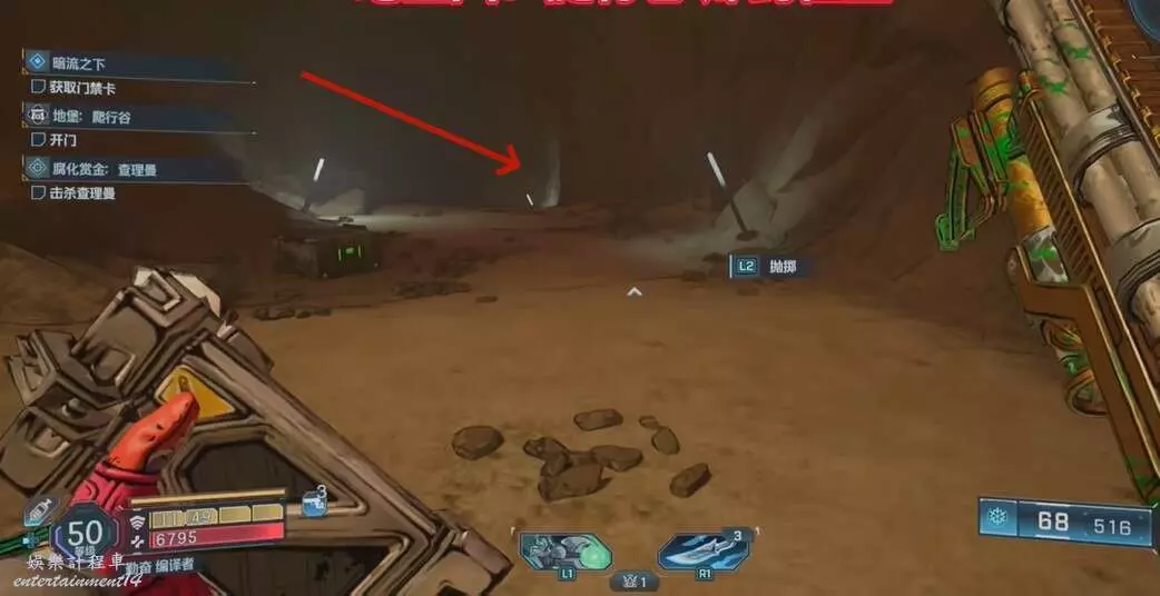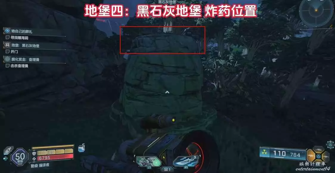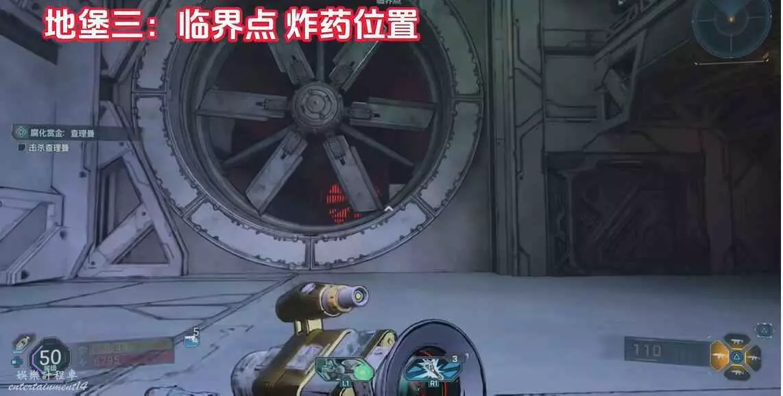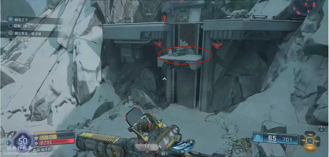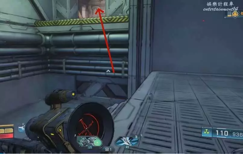 找到圖中平台,視角向右移動來到另一個平台上,拾取炸彈,向上拋擲炸開大門即可