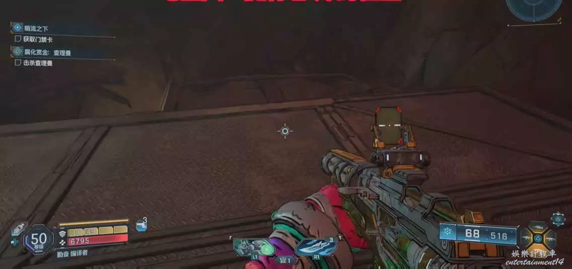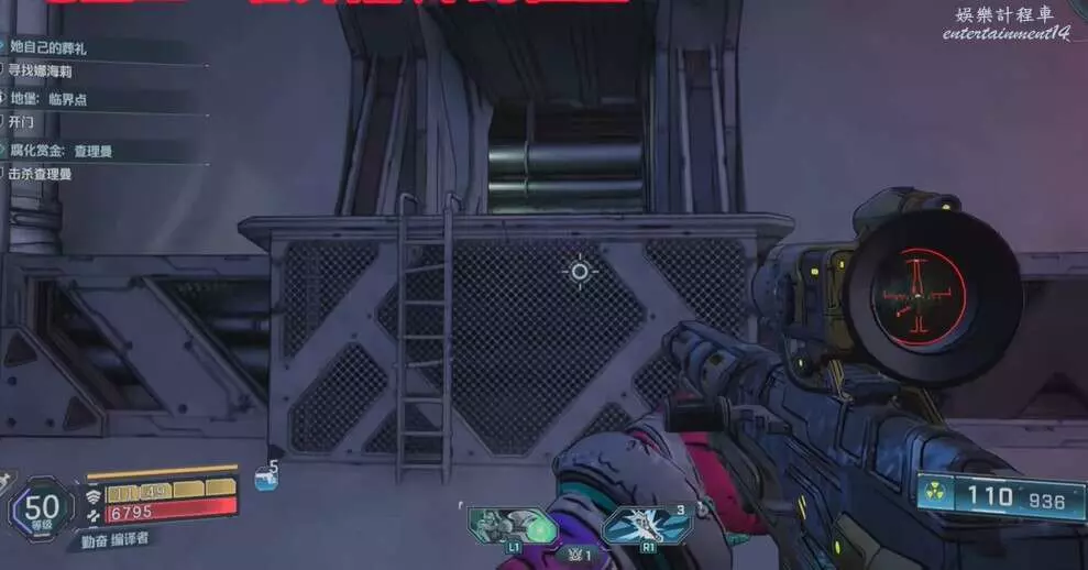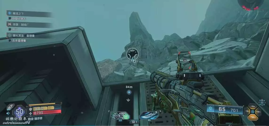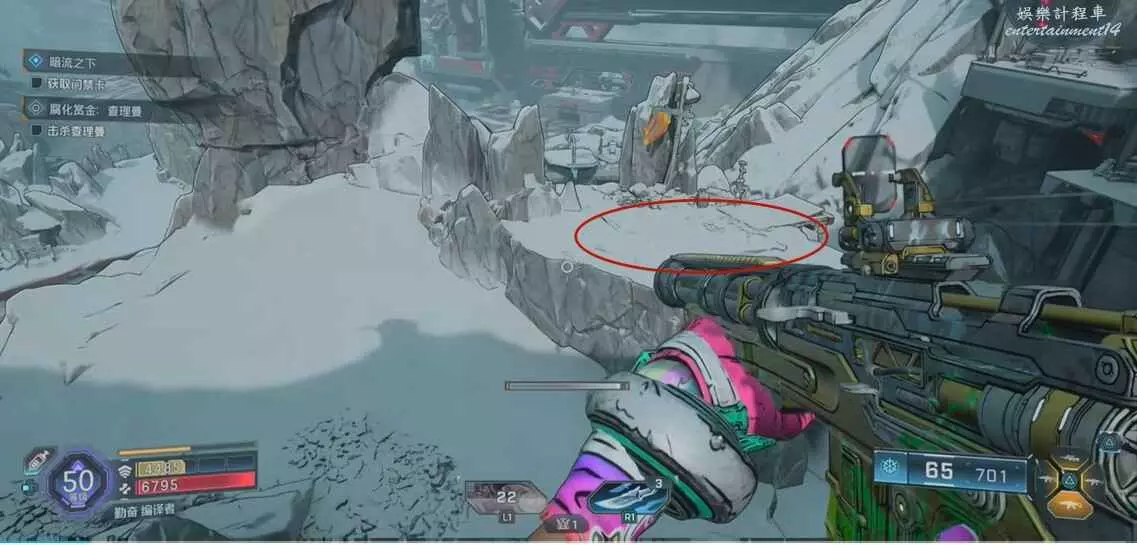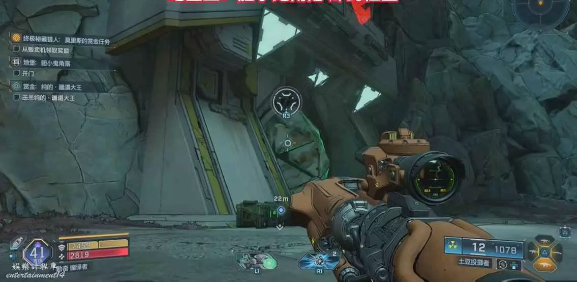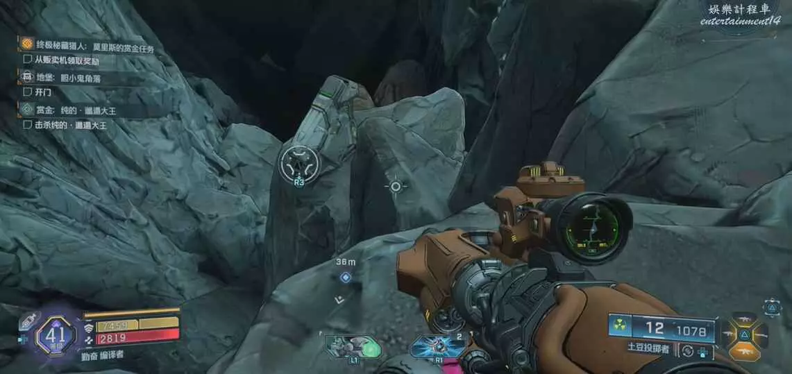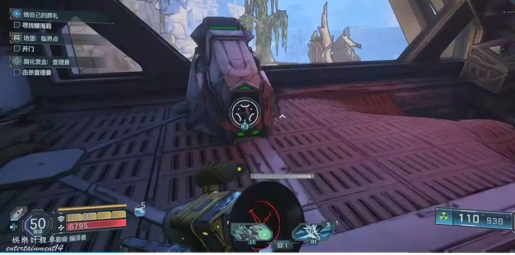 找到圖中平台,視角向右移動來到另一個平台上,拾取炸彈,向上拋擲炸開大門即可