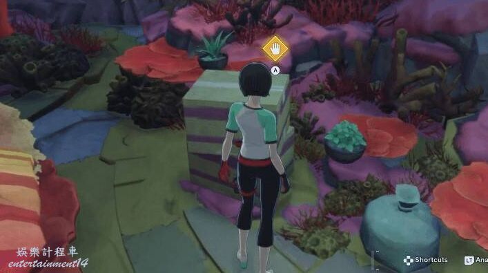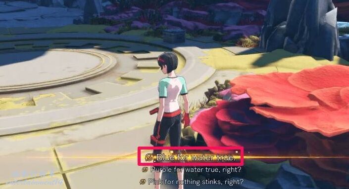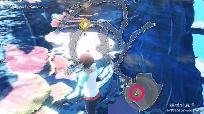 接著去水中尋找紫色水生植物,其位置在黃色圓圈中心偏西的閃光點處。