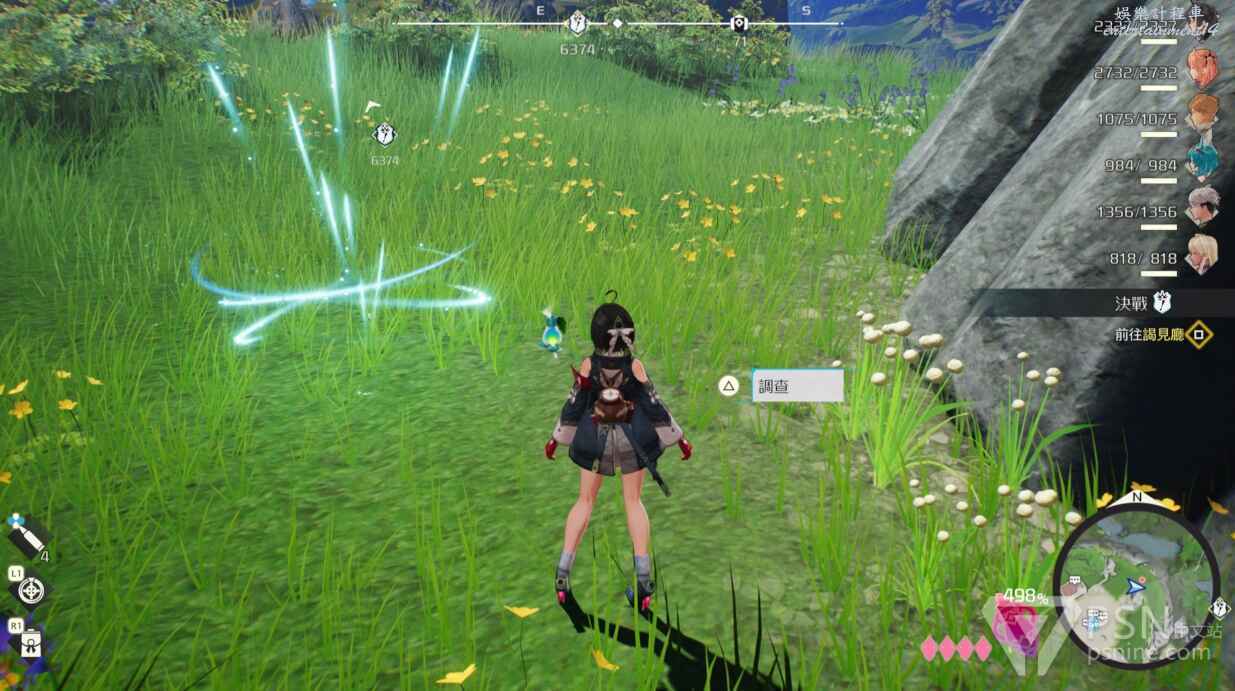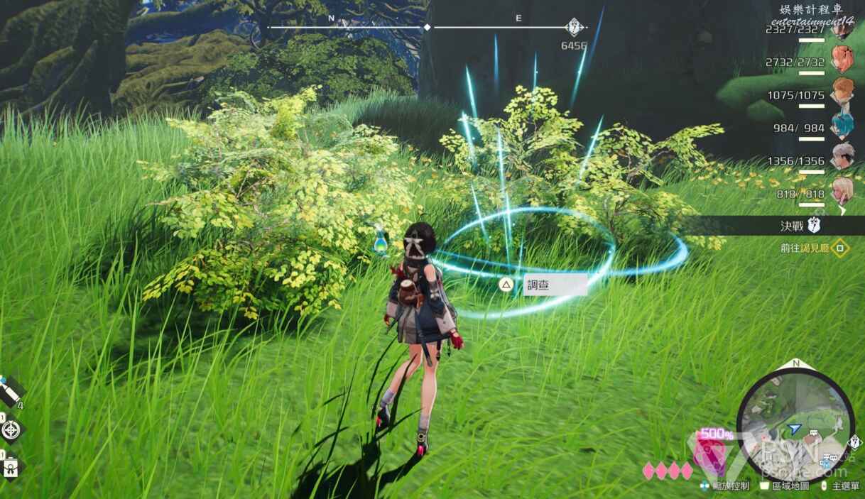 移動到這裡後,此處會有藍色指引線,這個遊戲裡經常會出現這樣的藍色指引線,跟著藍色指引線走,就會看到瑪娜間歇泉,對話就會獲得餘音斷片。所以流程中看到藍色指引線不妨多跟著藍色指引線去走,可以在流程中就能獲得許多餘音斷片。這個是此處的其中一個間歇泉,但是並不是最好的,最好的刷間歇泉的方法如下圖