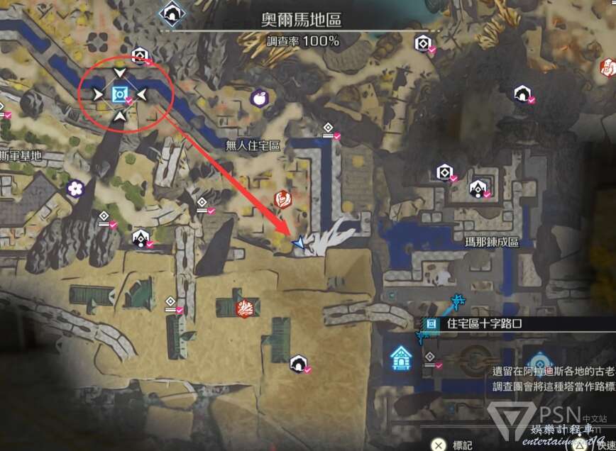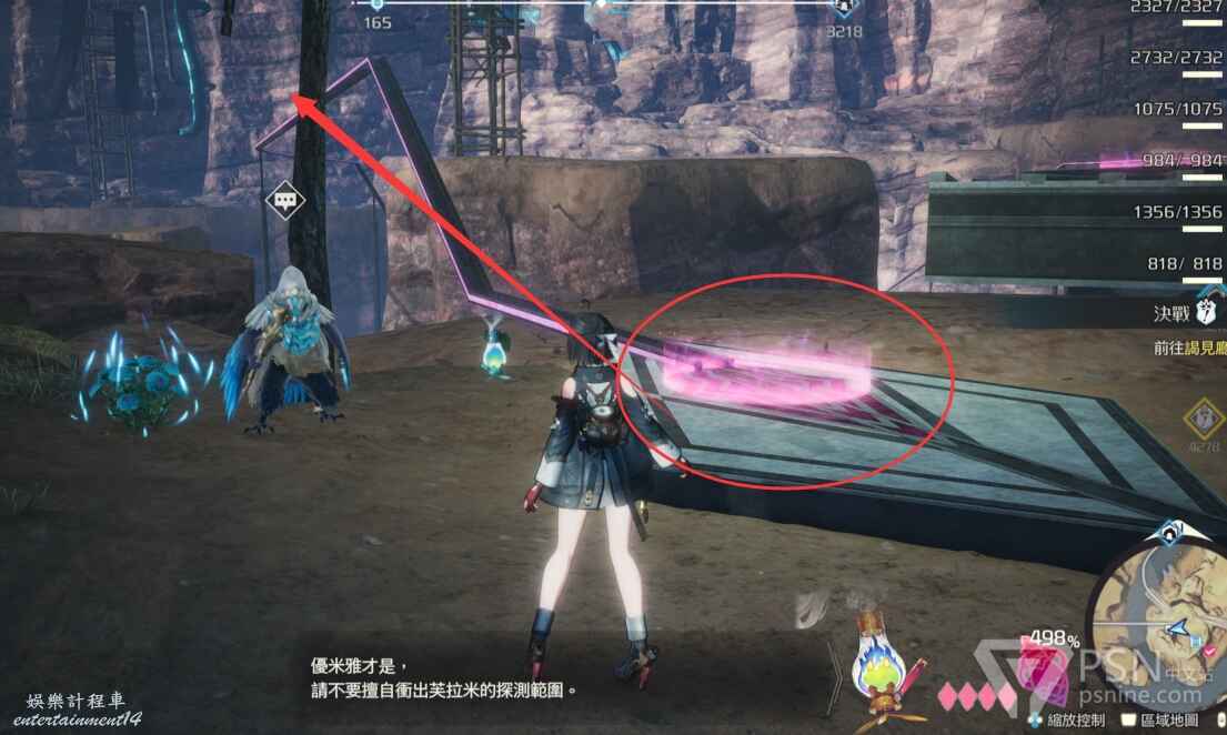 如果有DLC的話,可以在圖3奧爾馬地區如圖所示的建置區域造瑪娜間歇晶,注意旁邊還得造個能量機,因為瑪娜間歇晶需要消耗能量機的能量。這個地方使用瑪娜間歇晶DLC可以在箭頭位置刷出間歇晶,走兩步就到了,非常的近。不過間歇晶刷特性還不錯,刷餘音斷片的效率感覺遠不如間歇泉,數量給的比間歇泉要少,很多時候還只會刷出來小和中餘音斷片,刷不出來大,也不知道是不是刷的姿勢不對