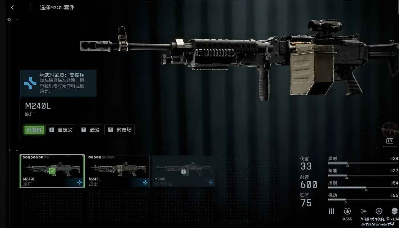 第六把是機槍真神m240l,20m內三槍死ttk200力壓433和a1,20m外四槍死ttk300也比大部分步槍要強,這就是我們的m240l大人,趁著目前還解鎖的不多還能爽爽,等以後全都是m240l往那一架就別想過來了。值得一提的是這把槍有一個bug,75和100彈匣換單時間只有0.555s,當然只是顯示問題實際上沒有任何加成。