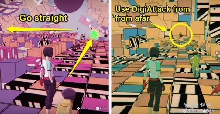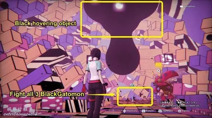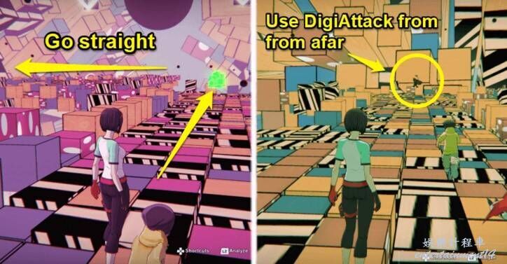 ③繼續沿著這條路走。左轉直走,你會看到第三輛 BlackGatomon 閒置。為了防止它傳送離開,一旦你接近它,就開始按下 DigiAttack 的按鈕,然後擊敗它。