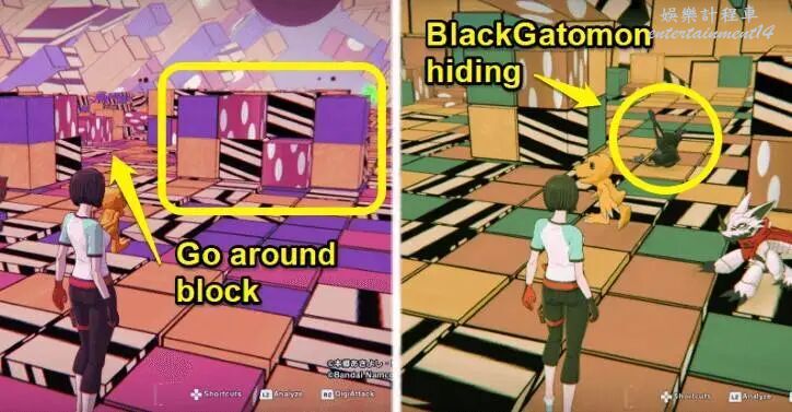 ②如果你沿著右邊的小路走,你應該會在路上看到一個塊狀的障礙物。繞過障礙物,你會看到第二個 BlackGatomon 躲在它後面。攻擊它以捕獲它。
