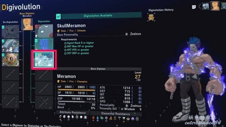 進化骷髏火焰獸:若屬性不足,可使用強化訓練(Load Enhancements)提升能力。