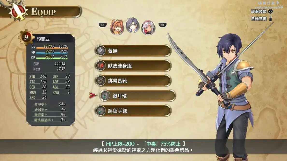 裝備飾品方面,與約修亞相同,銀耳環防止暴斃。