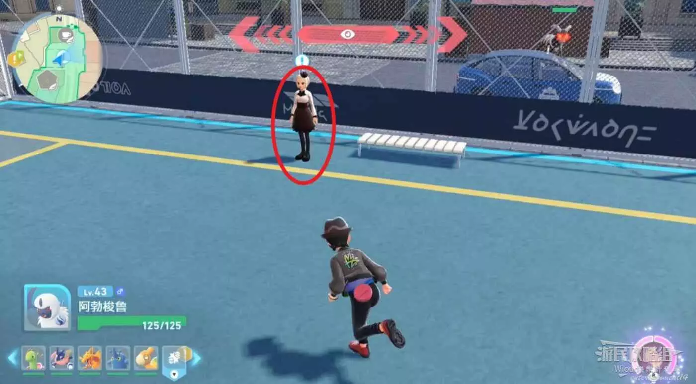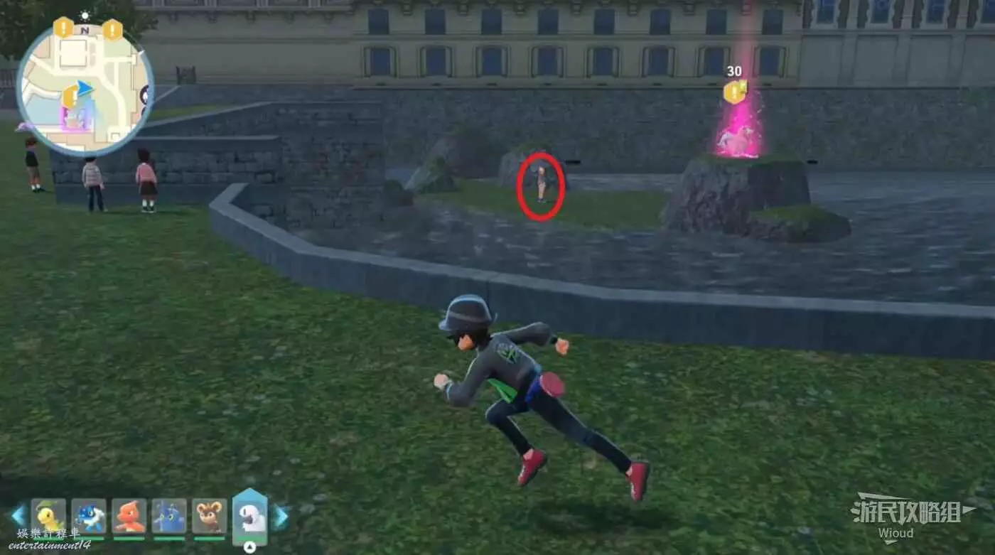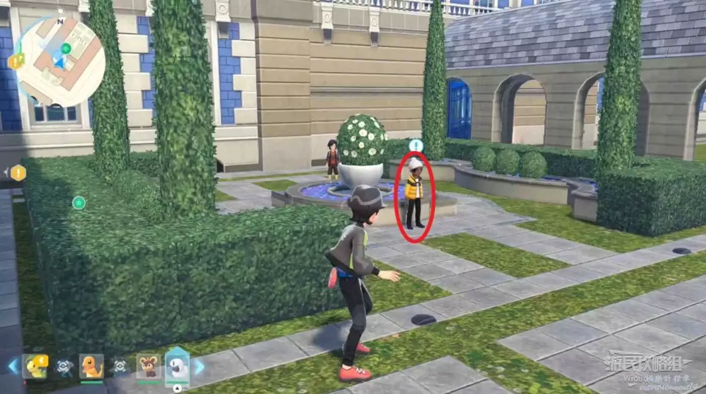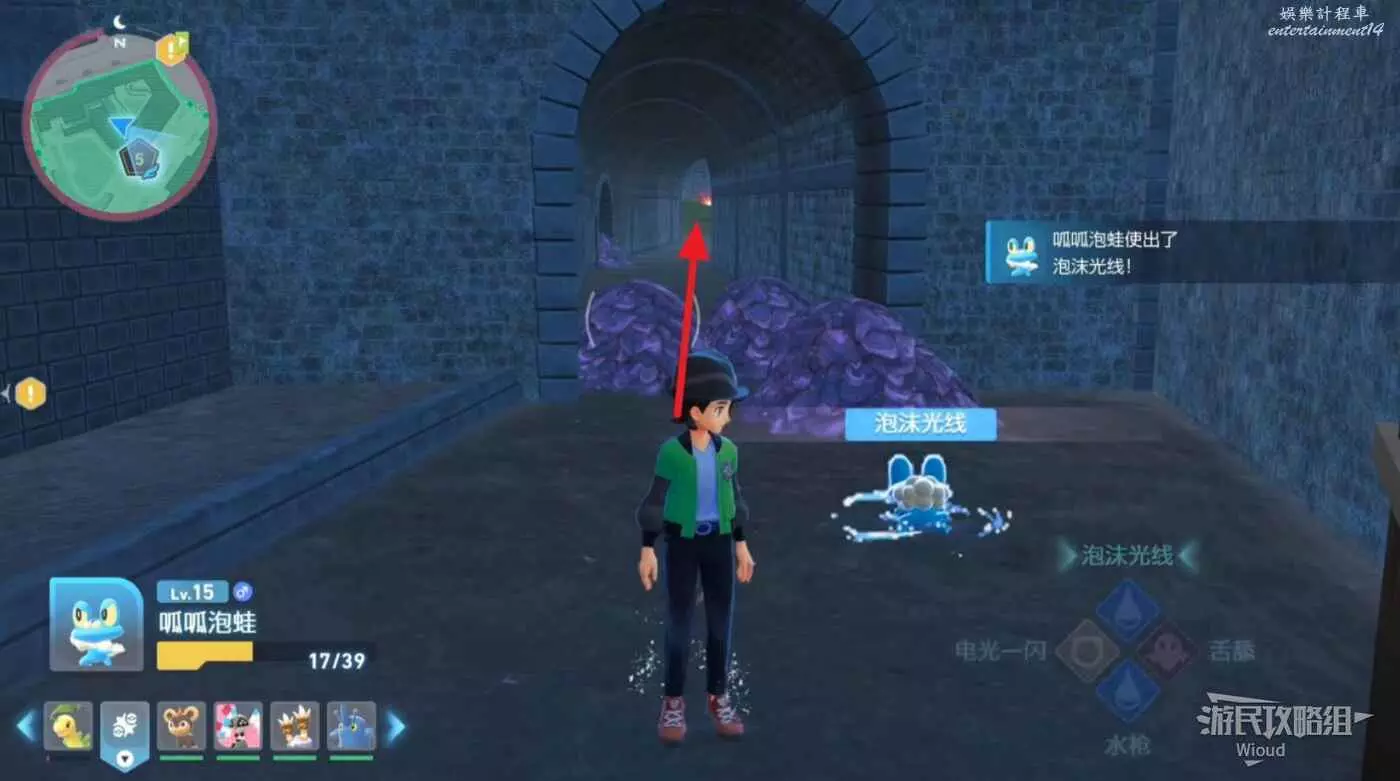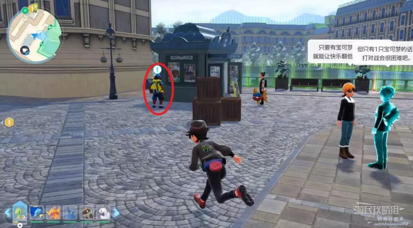沿路往裡走,擊敗NPC的寶可夢積攢點數,按下左搖杆進入潛行狀態,然後操控寶可夢發動先行攻擊可造成大量傷害。
