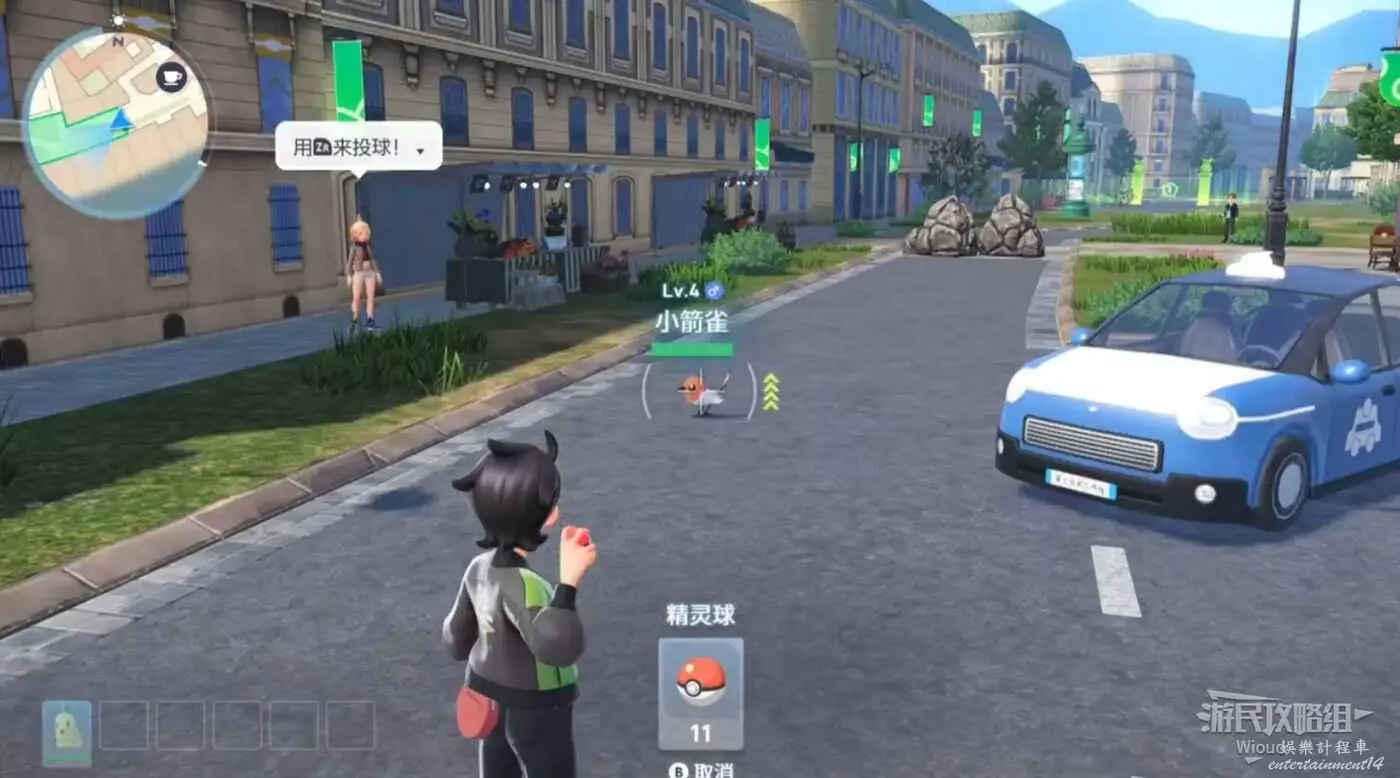 按下十字鍵上放出我們的寶可夢,鎖定周圍寶可夢攻擊它們,當野生寶可夢的血條被打空會進入眩暈狀態,此時投擲精靈球可大幅提高抓獲幾率。