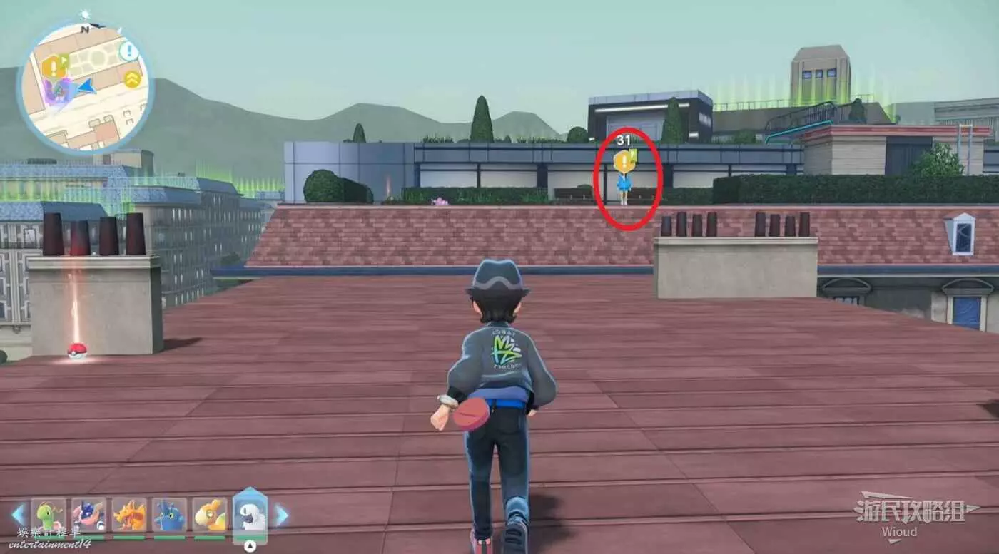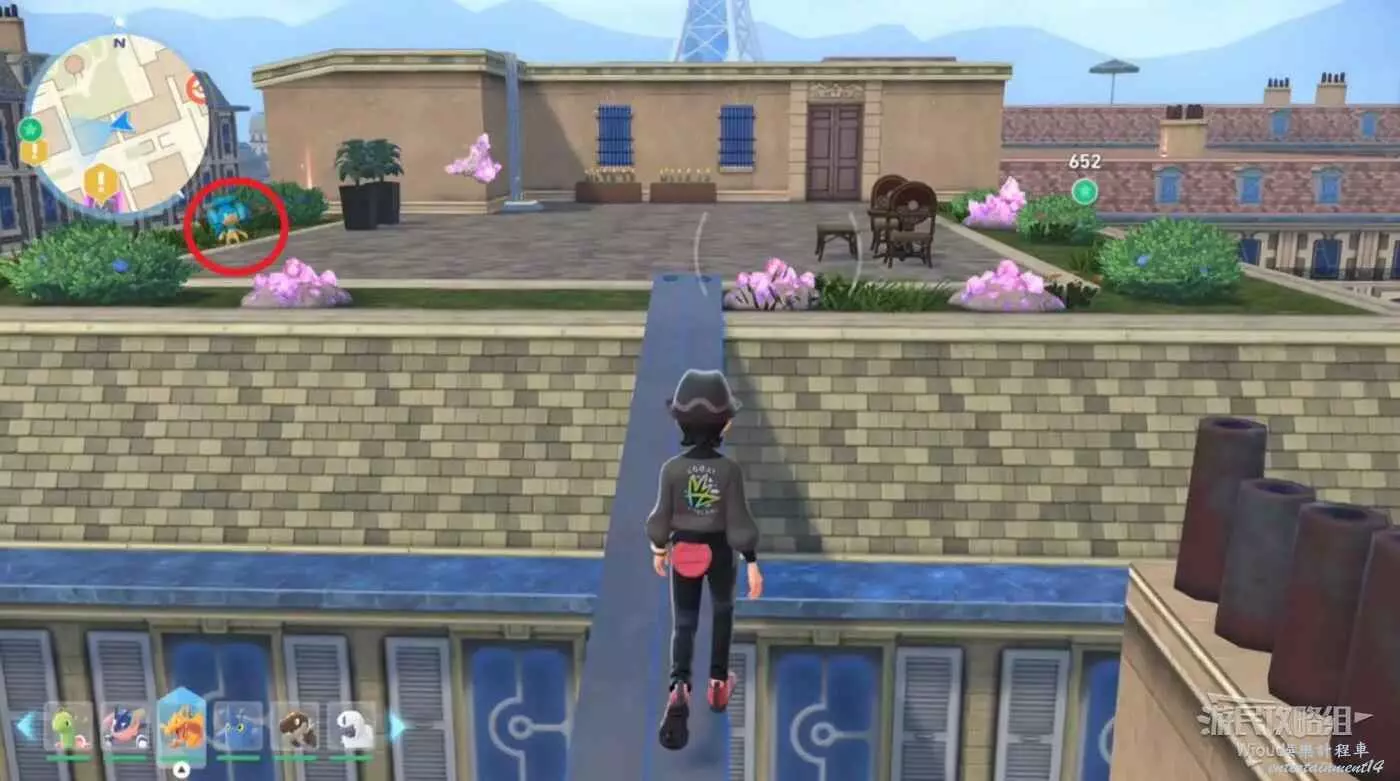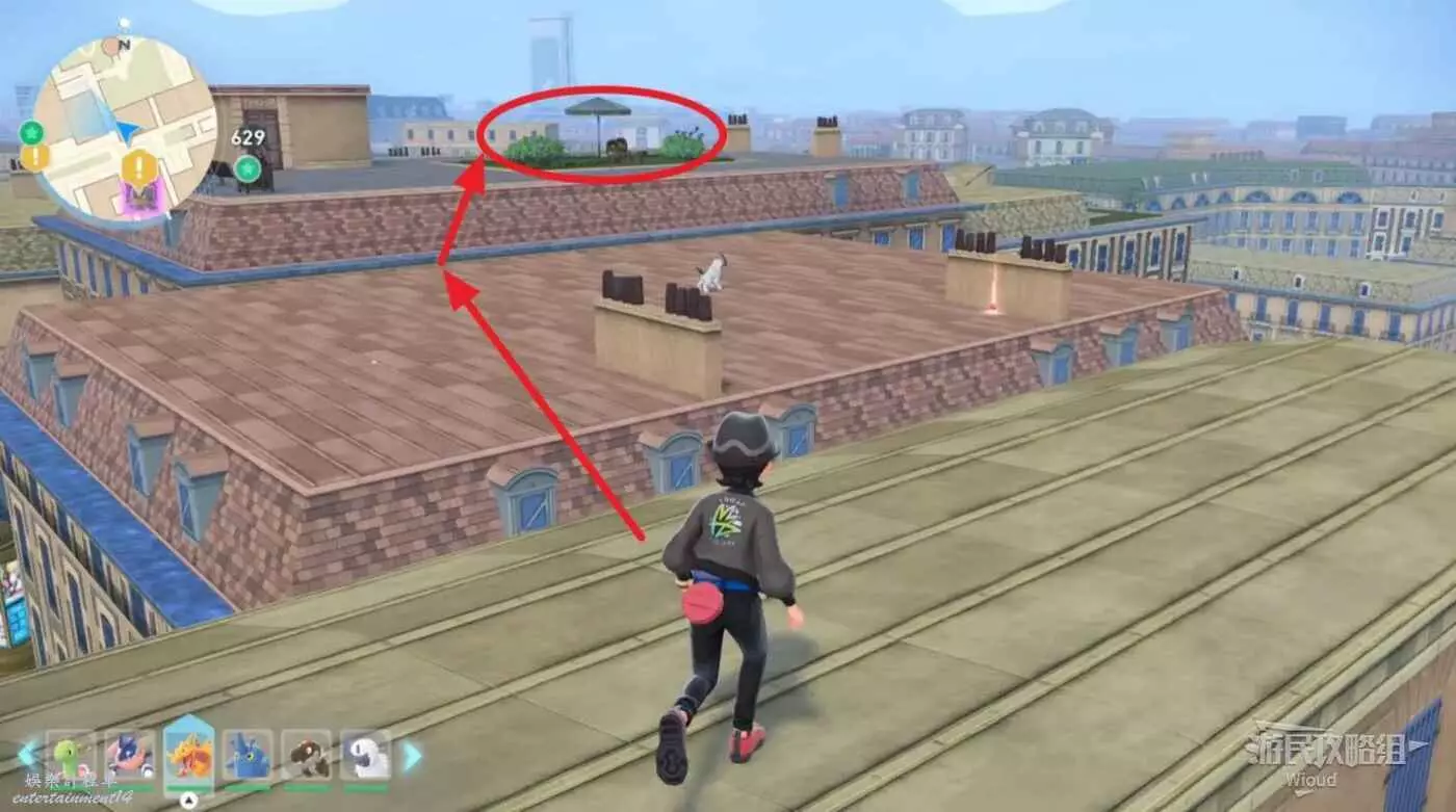 先和屋頂的【玳蘿】對話,然後爬右側小屋的梯子再過橋,不遠處看到失控寶可夢。