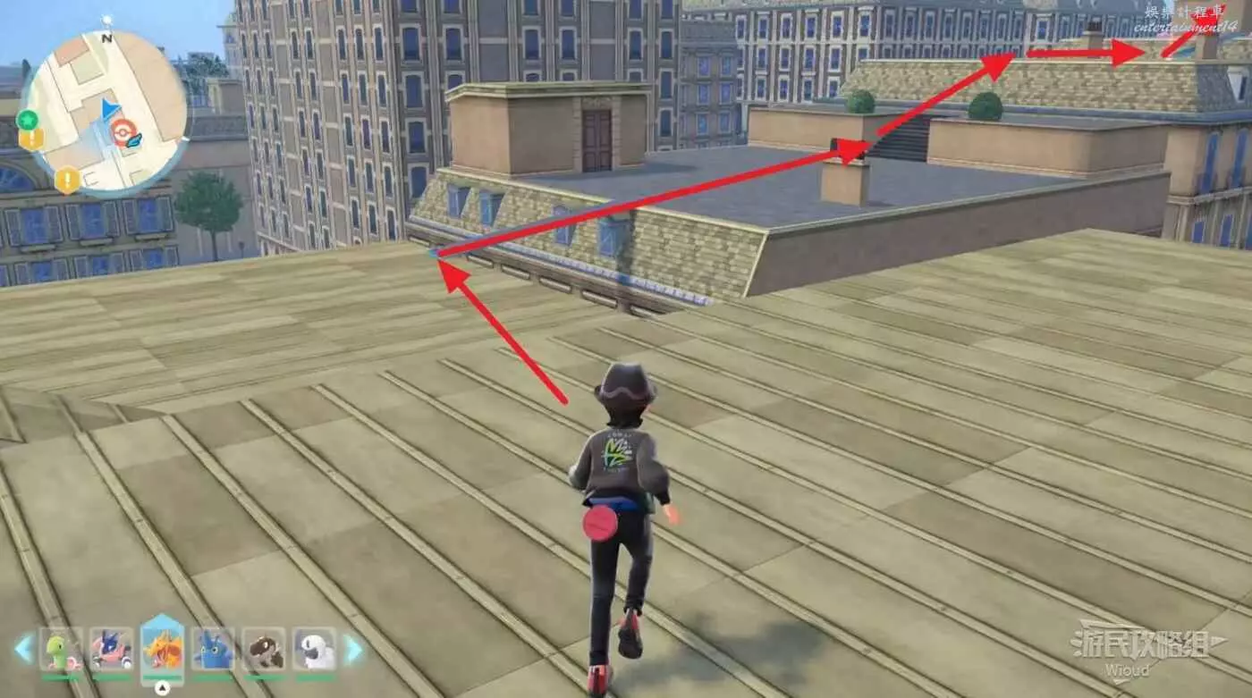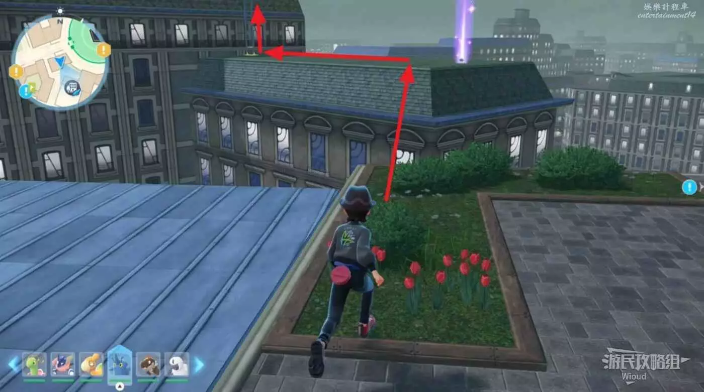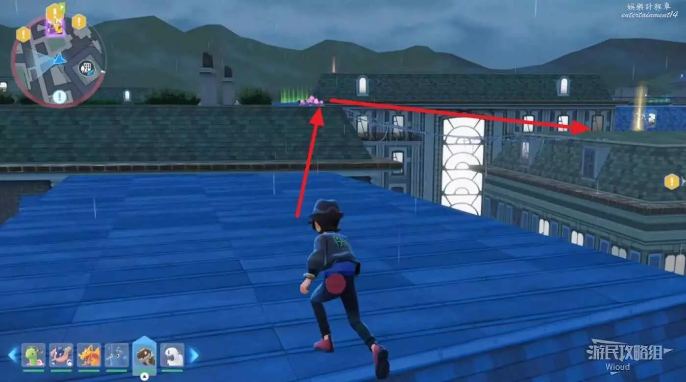 跟隨【蓋伊/塔霓】走到旅館門口側後方的梯子,用寶可夢的技能破壞梯子上的障礙物,爬到房頂從對面跳下去。