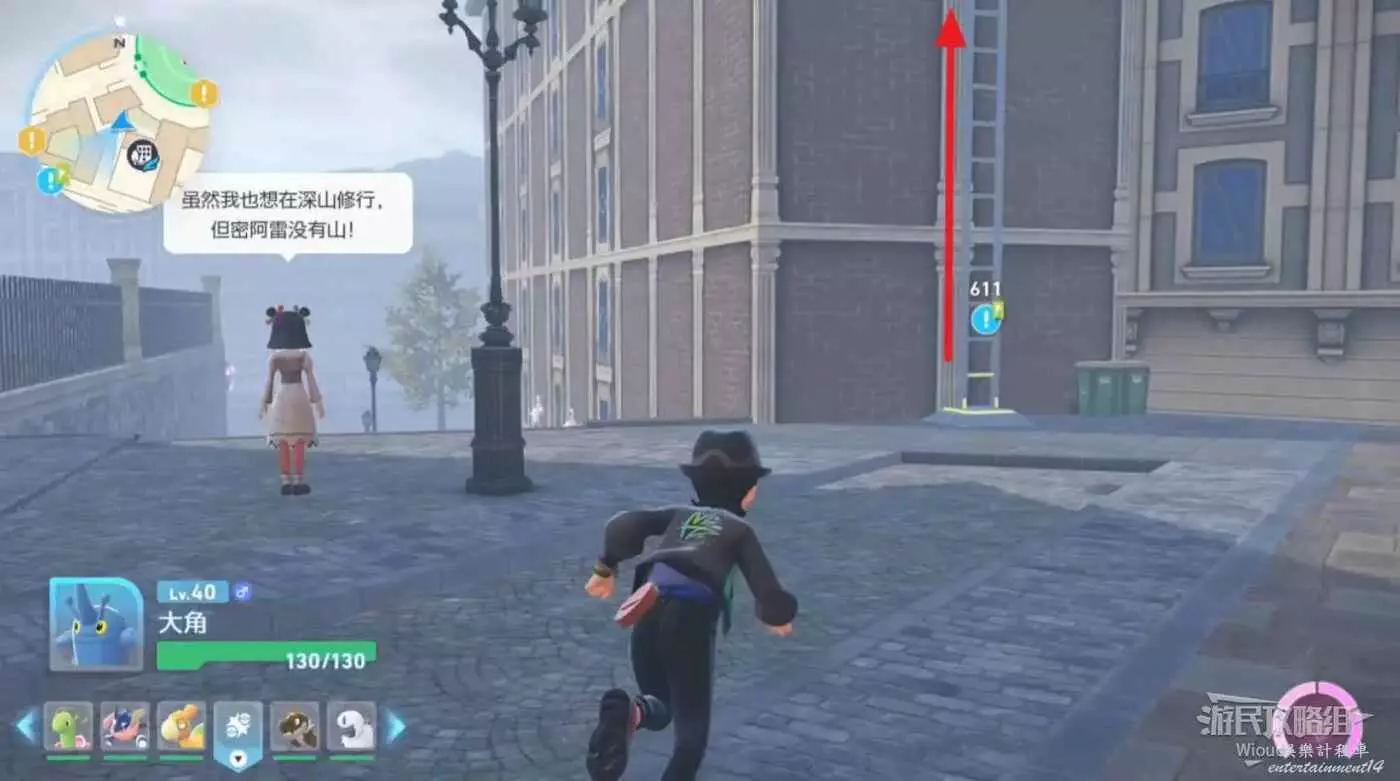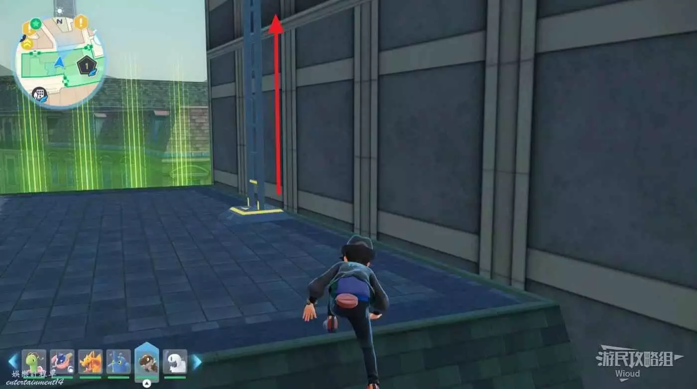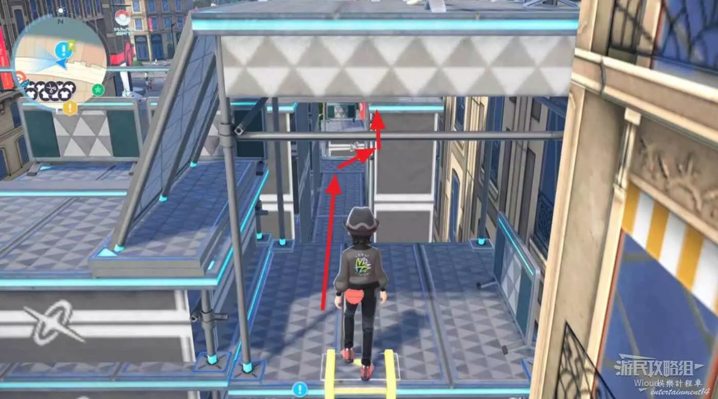 跟隨【蓋伊/塔霓】走到旅館門口側後方的梯子,用寶可夢的技能破壞梯子上的障礙物,爬到房頂從對面跳下去。