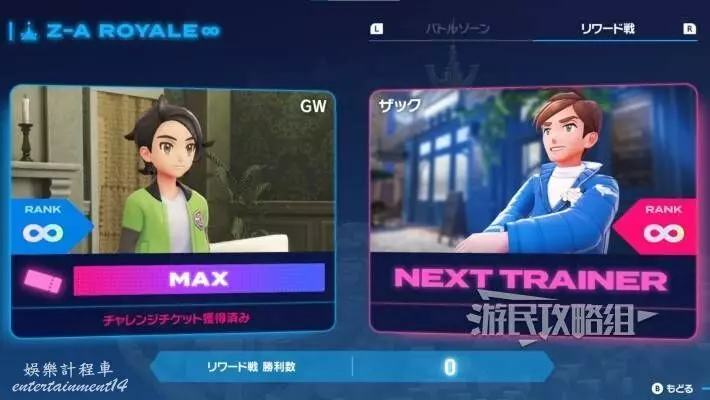 通關後ZA登峰戰會升級強化變為登峰戰∞,並有更強大的訓練家們參與。在無限賽中獲得挑戰券後,即可獲得獎勵戰的挑戰權。在此模式下可以再次對戰過去晉級賽中交戰過的角色,獲勝即可獲得豐厚獎勵。