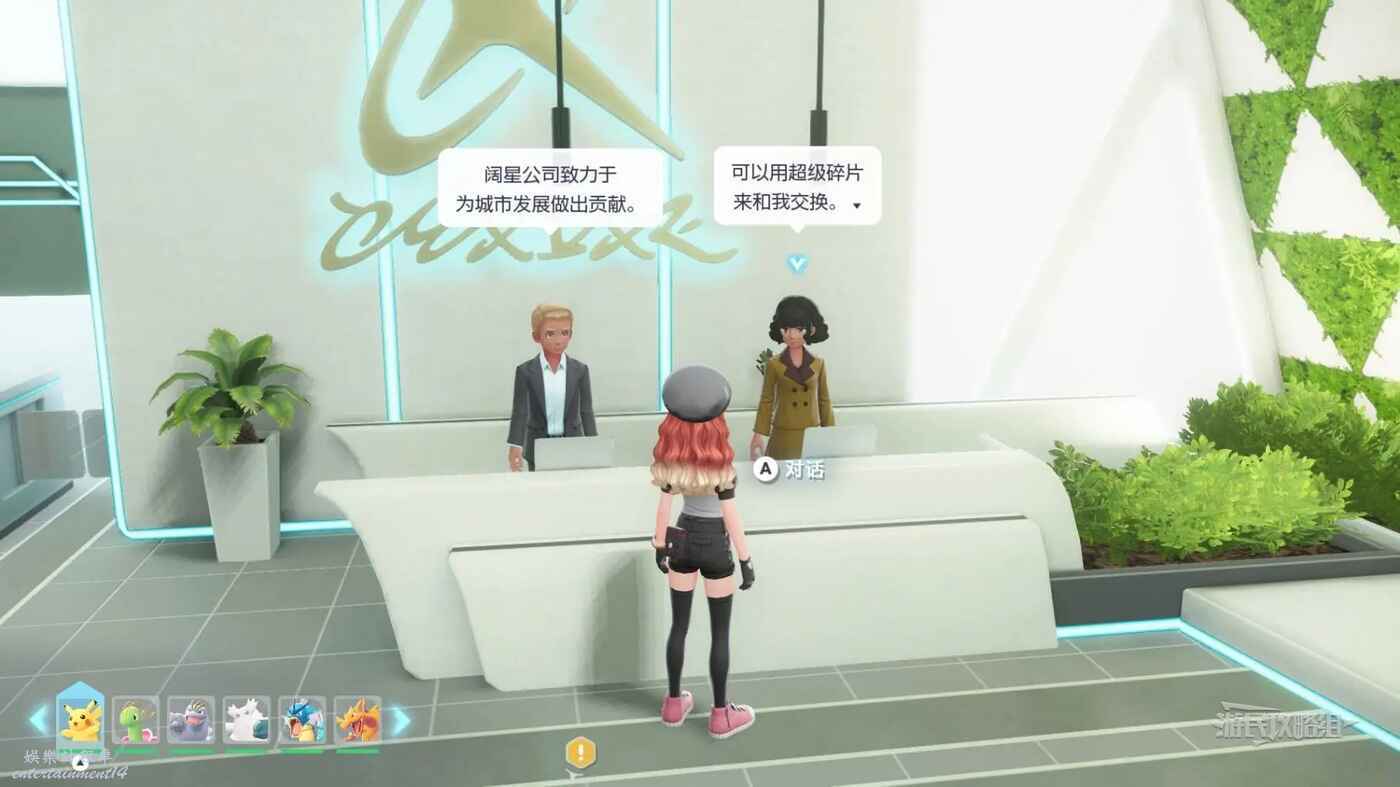 將主任務10期間可前往闊星公司大樓內部。與闊星公司內的櫃台小姐姐對話可以使用超級碎片來兌換經驗糖果和超級石,超級碎片可以通過清理散落在密阿雷市街道中的超級結晶來獲得,超級結晶可以用寶可夢招式來清理,例如劈瓦等。可兌換的超級石是隨主線進度逐步解鎖的,所有超級石在通關主線後依然可以繼續購買。以下是可以在闊星公司用超級碎片兌換獲得的進化石。
