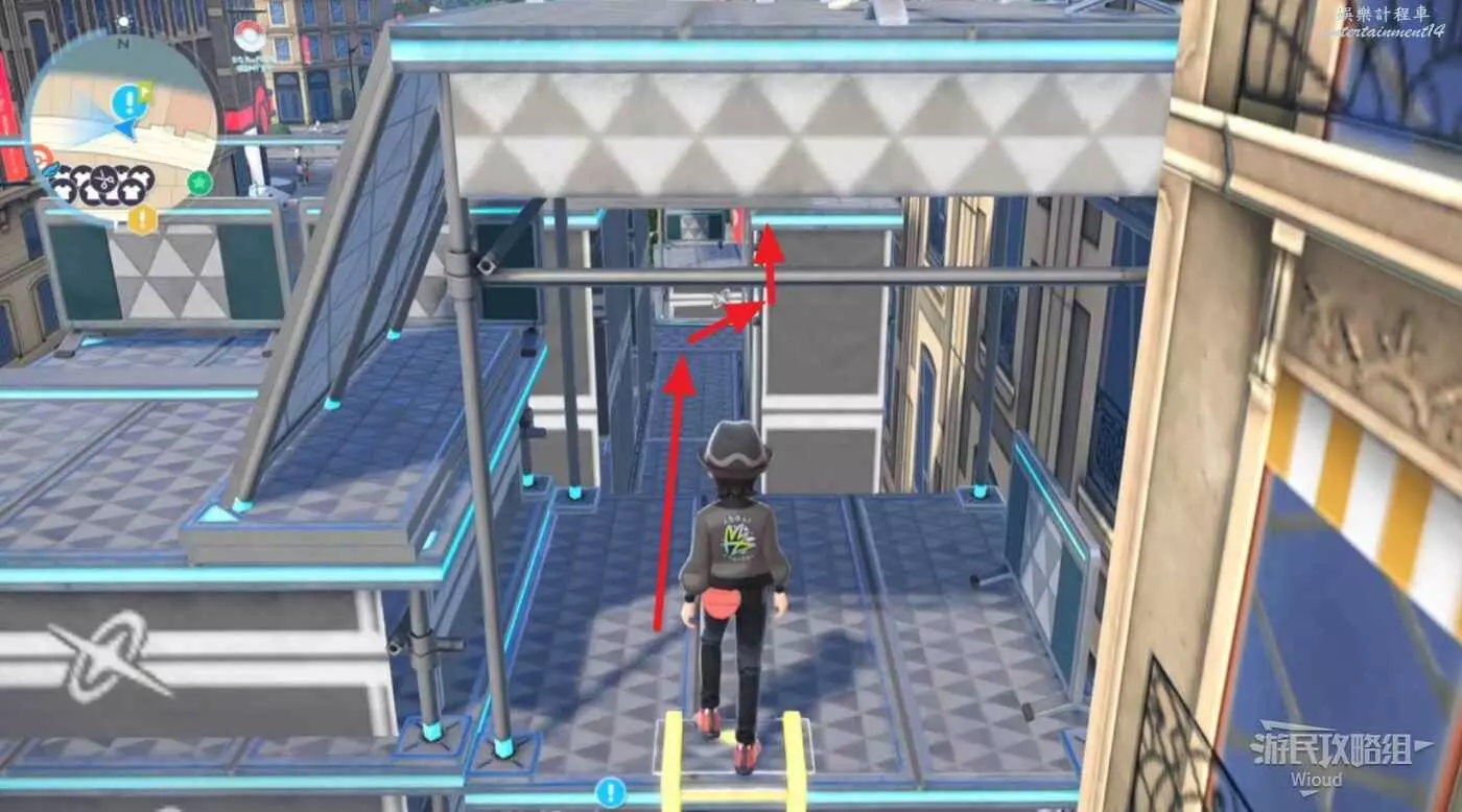 先沿著紅色箭頭爬盡頭樓梯到2層,然後沿著黃色箭頭往回走,盡頭樓梯爬到呱呱泡蛙的位置即可。