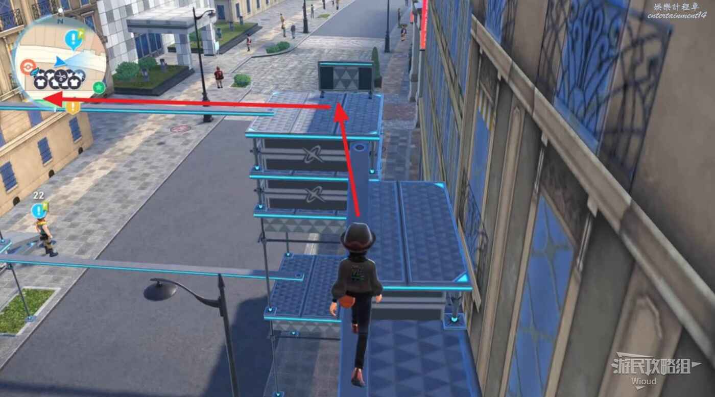 先沿著紅色箭頭爬盡頭樓梯到2層,然後沿著黃色箭頭往回走,盡頭樓梯爬到呱呱泡蛙的位置即可。