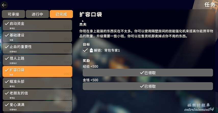 擴容口袋這個任務需要解鎖背包專家,這其實是個天賦,就是咱左邊這個科技樹。