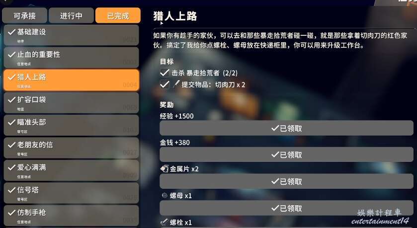 獵人上路需要我們殺兩個暴走拾荒者,而後提交兩個切肉刀。
