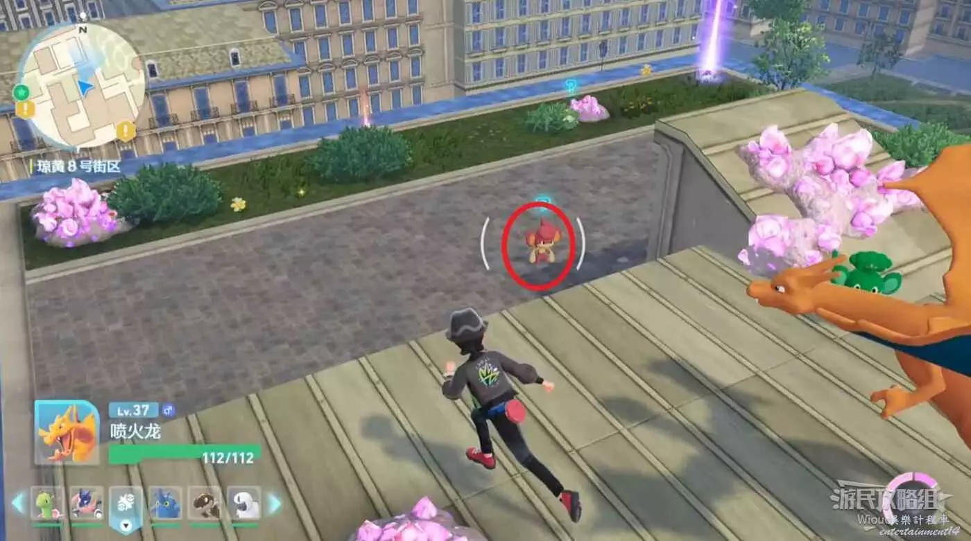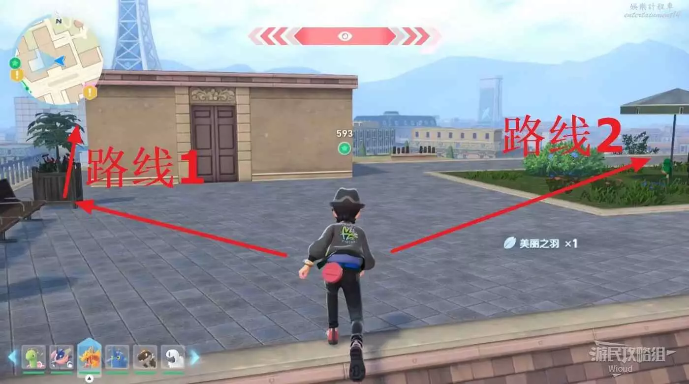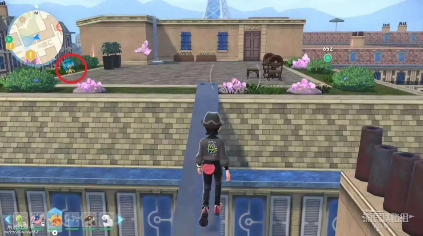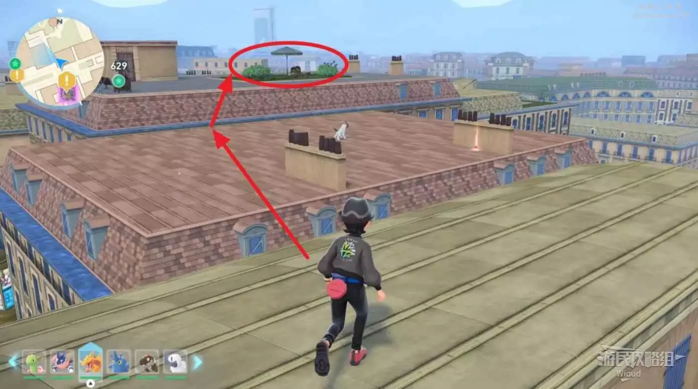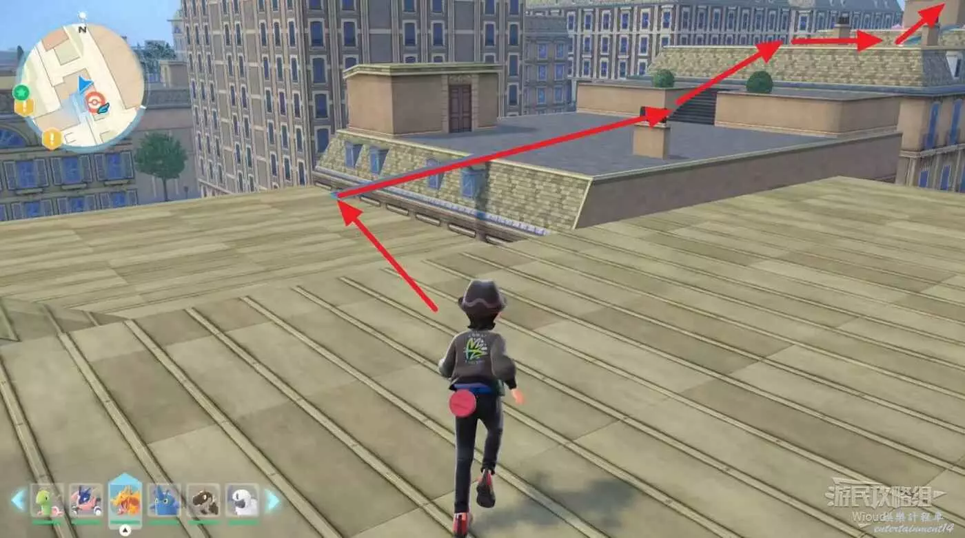 在寶可夢中心門口,沿著下圖路線爬樓梯上方右側的梯子到樓頂,上去往右走爬一段小梯子繼續往右繞。