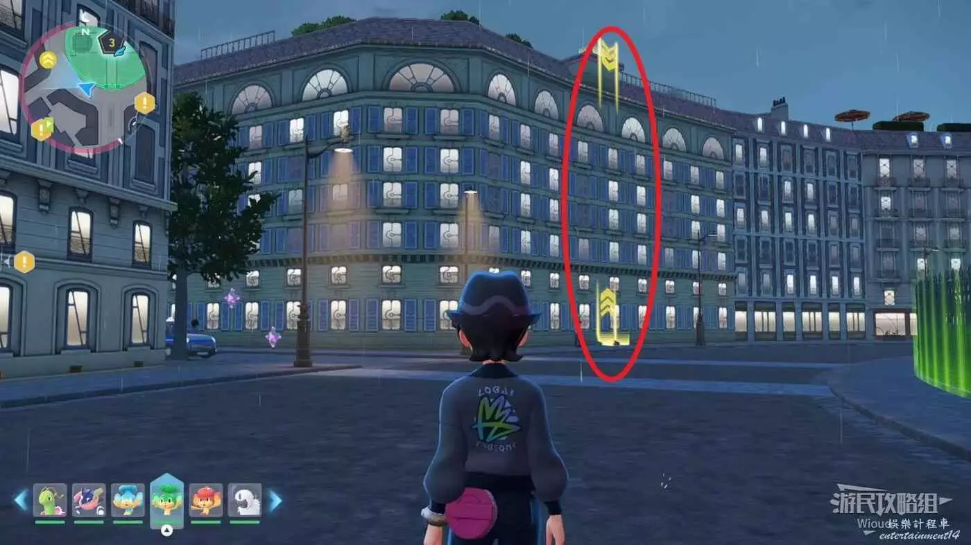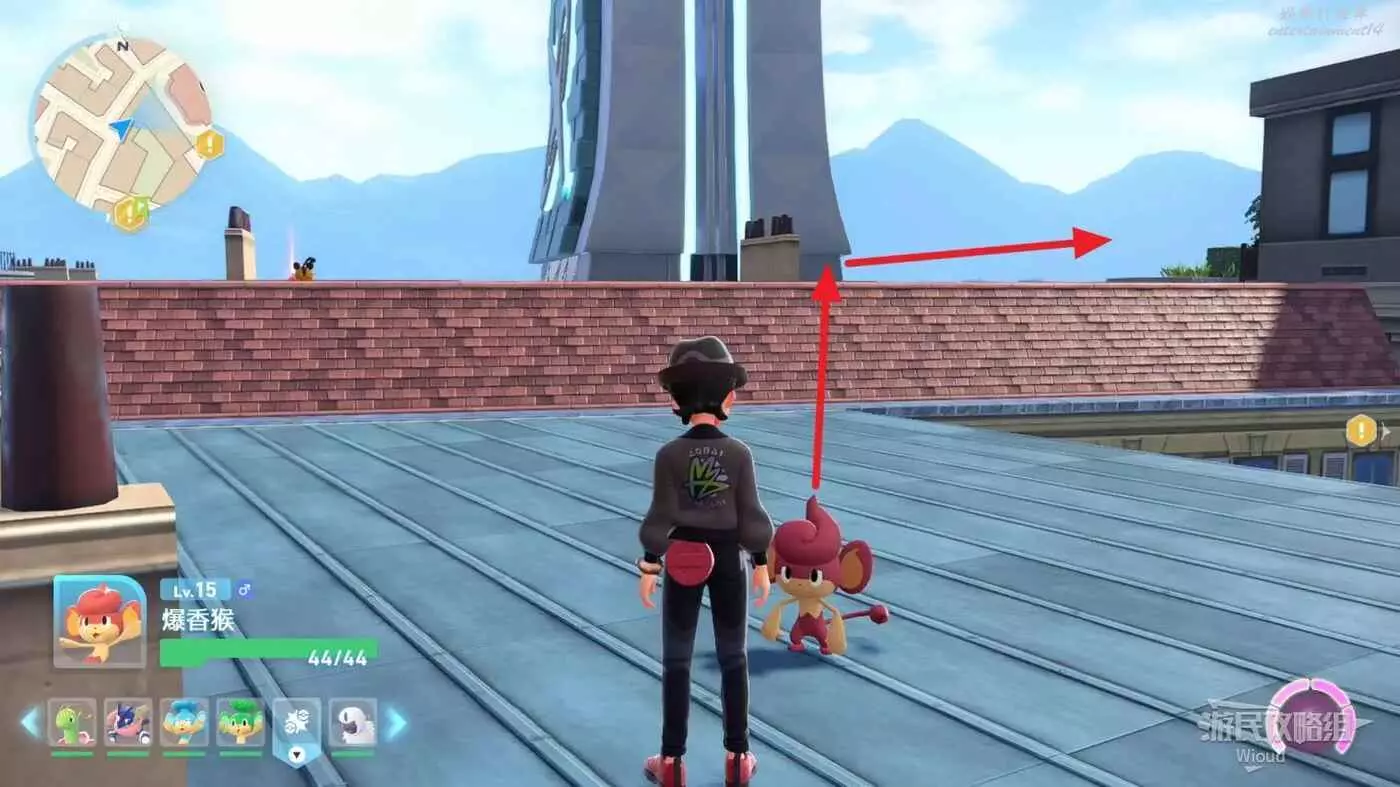 轉頭翻滾到對面平台,繼續爬梯子到屋頂,拿右側的金色精靈球即可。