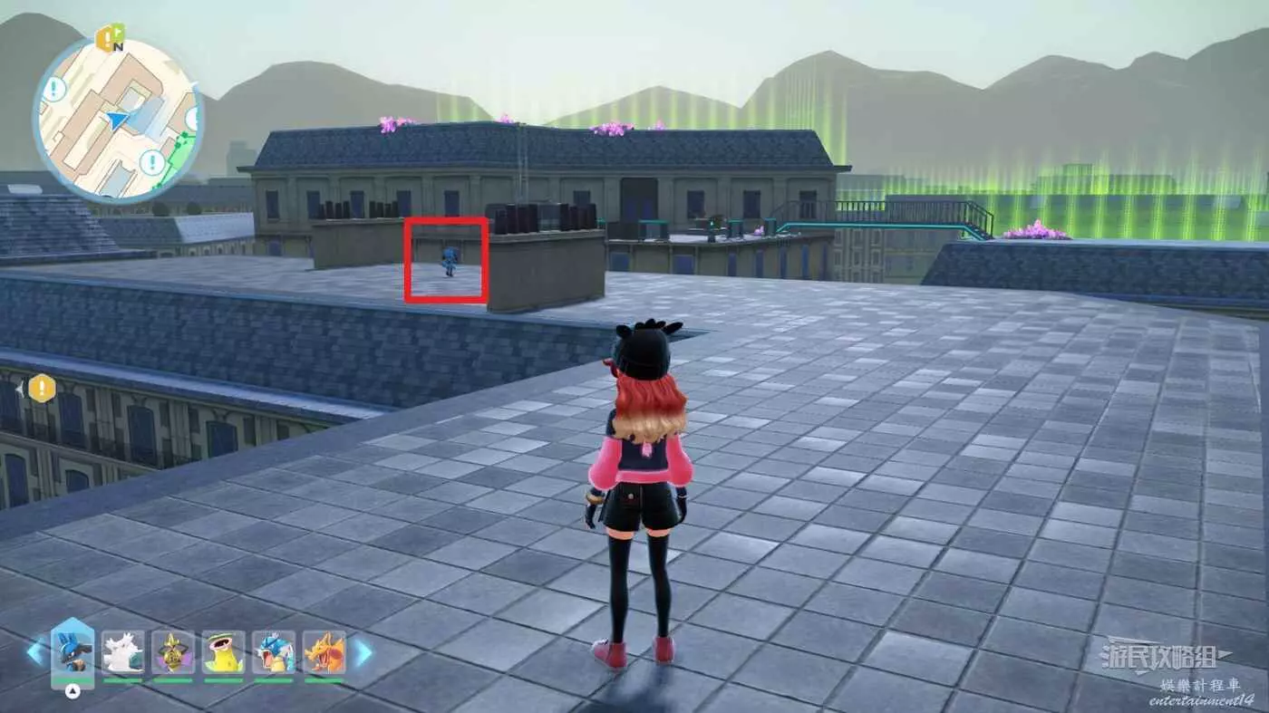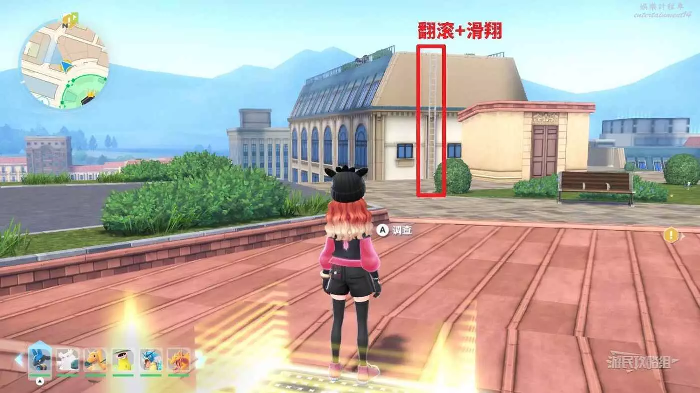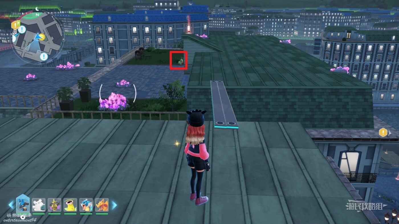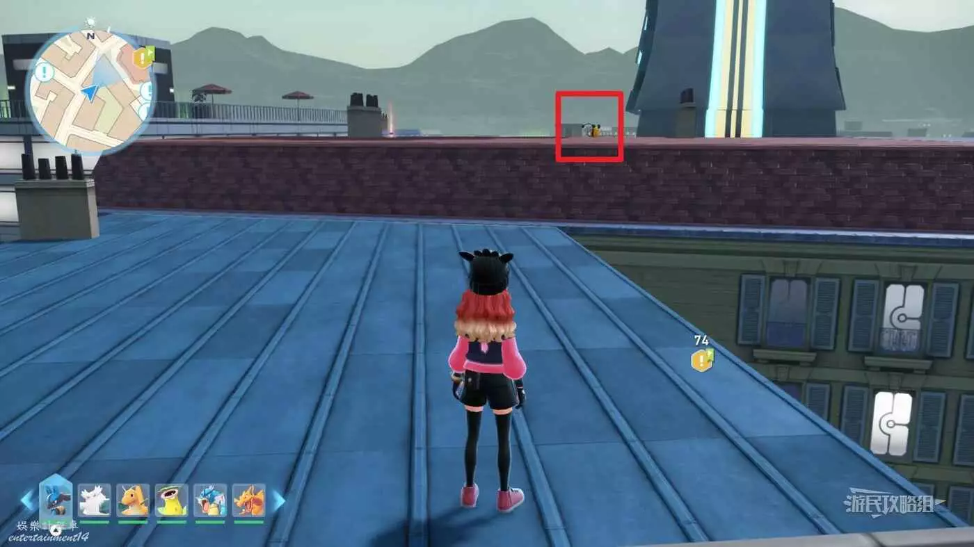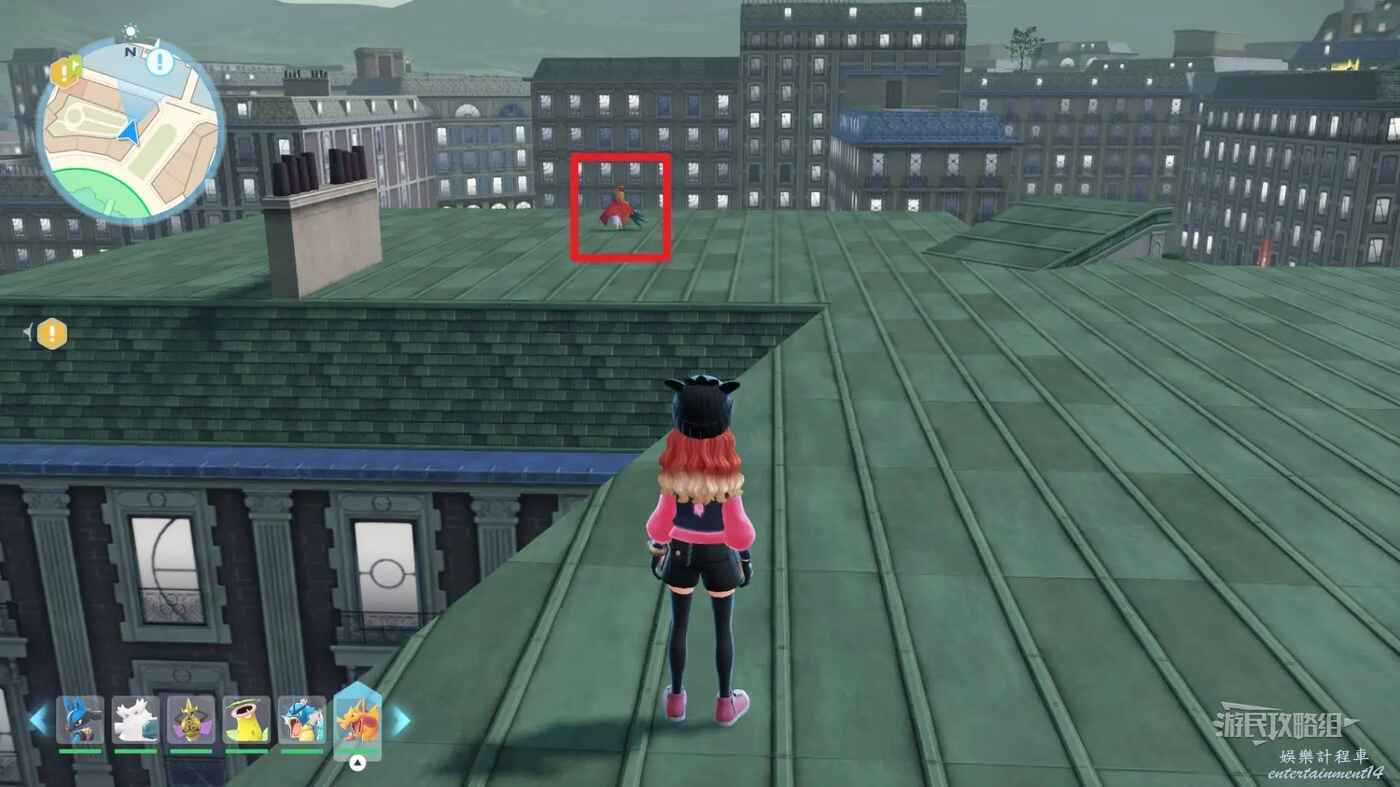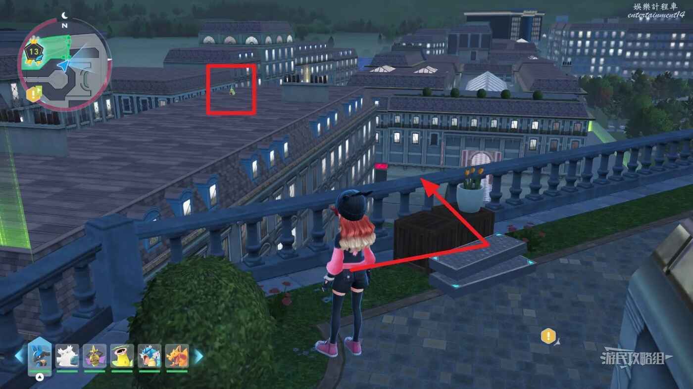 需要使用傳送梯到達房頂,然後打碎超級晶石過橋到對面房頂並左轉,使用洛托姆滑翔到達對面房頂爬梯子,繼續打開並走蜘蛛網到對面房頂,往左看就能看到迷你龍,附近有很多長椅。