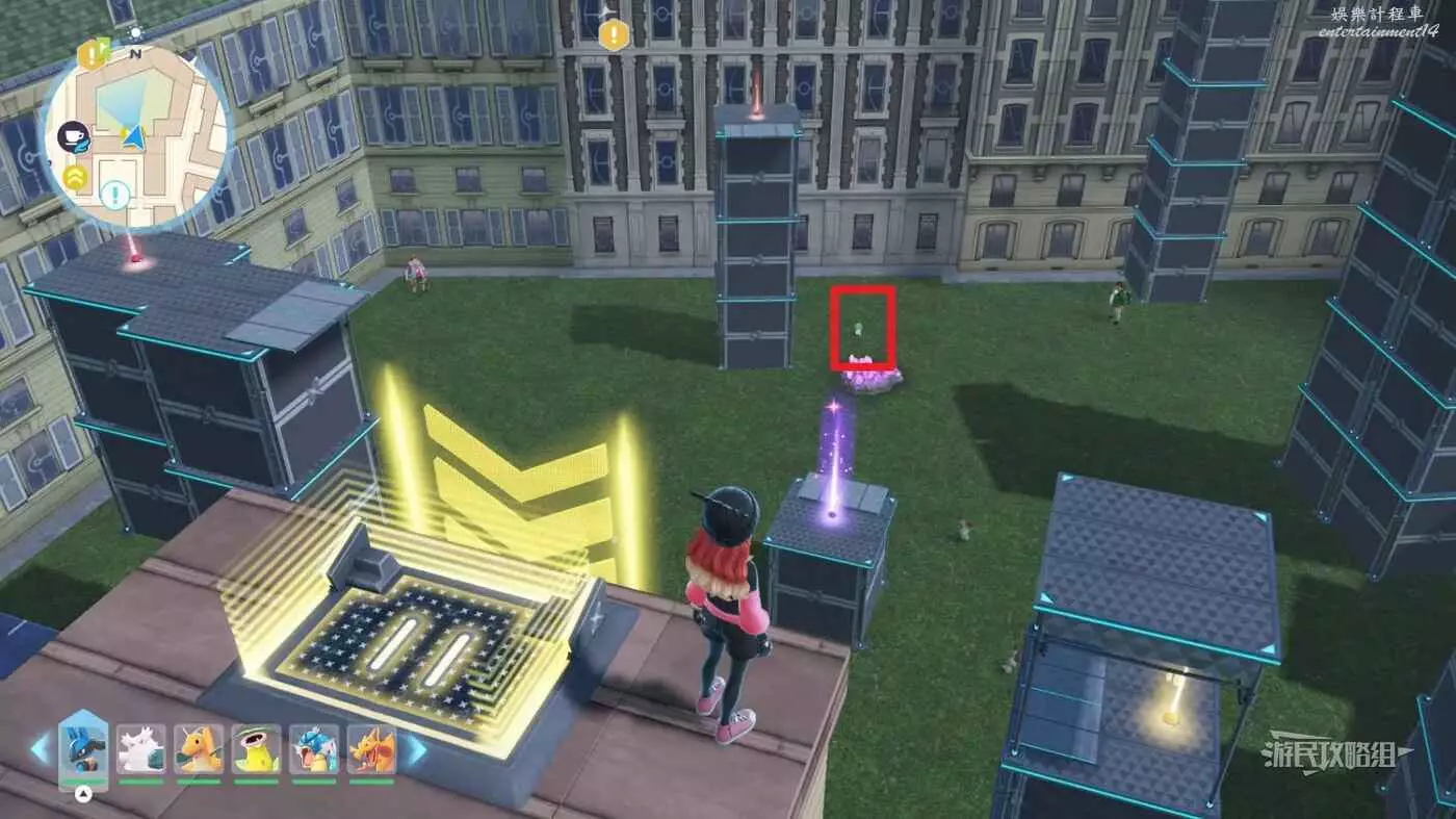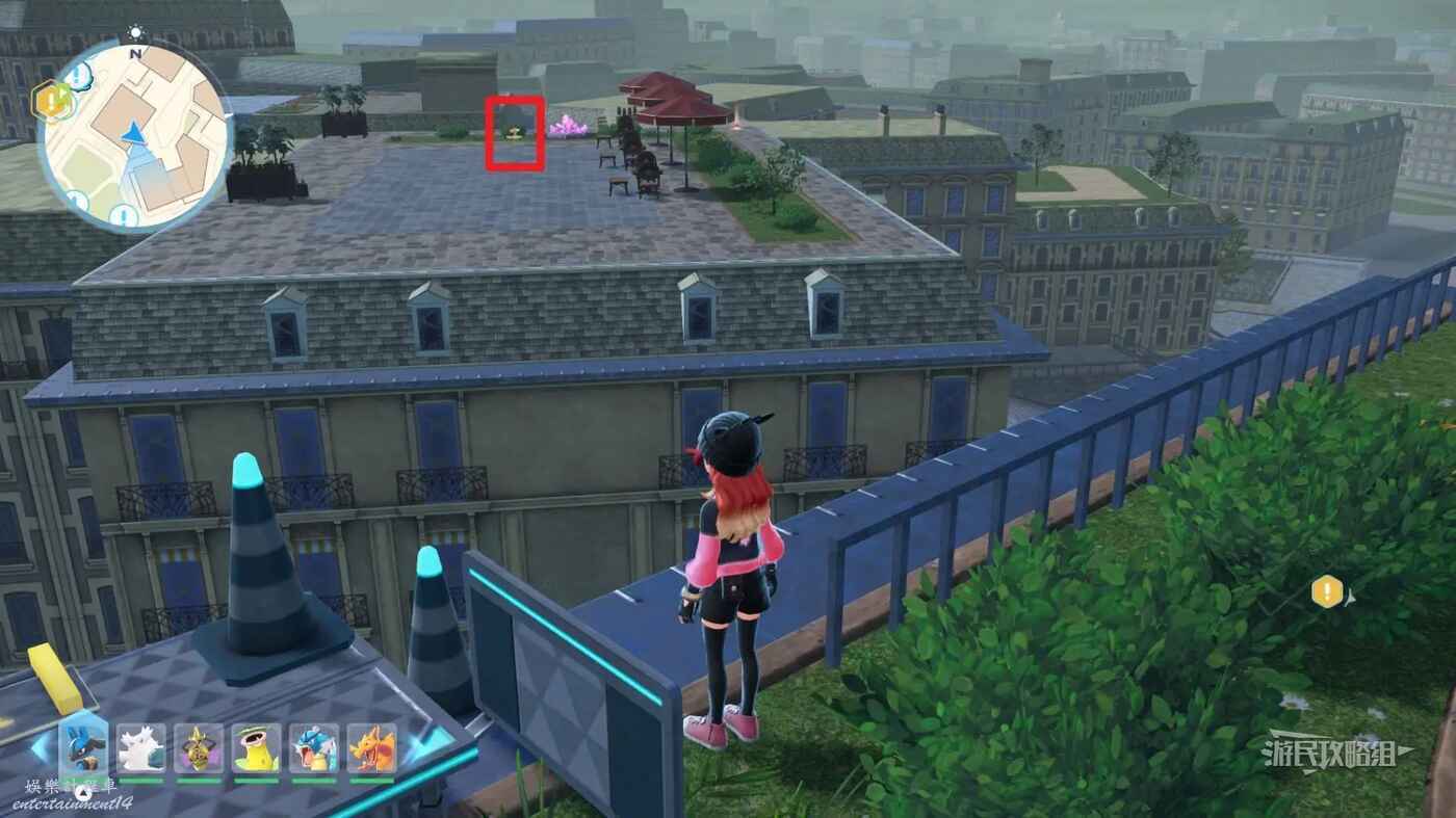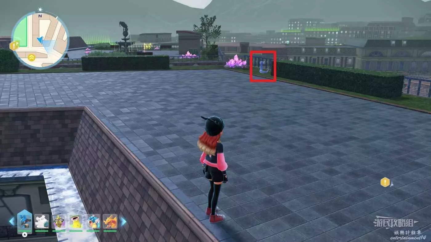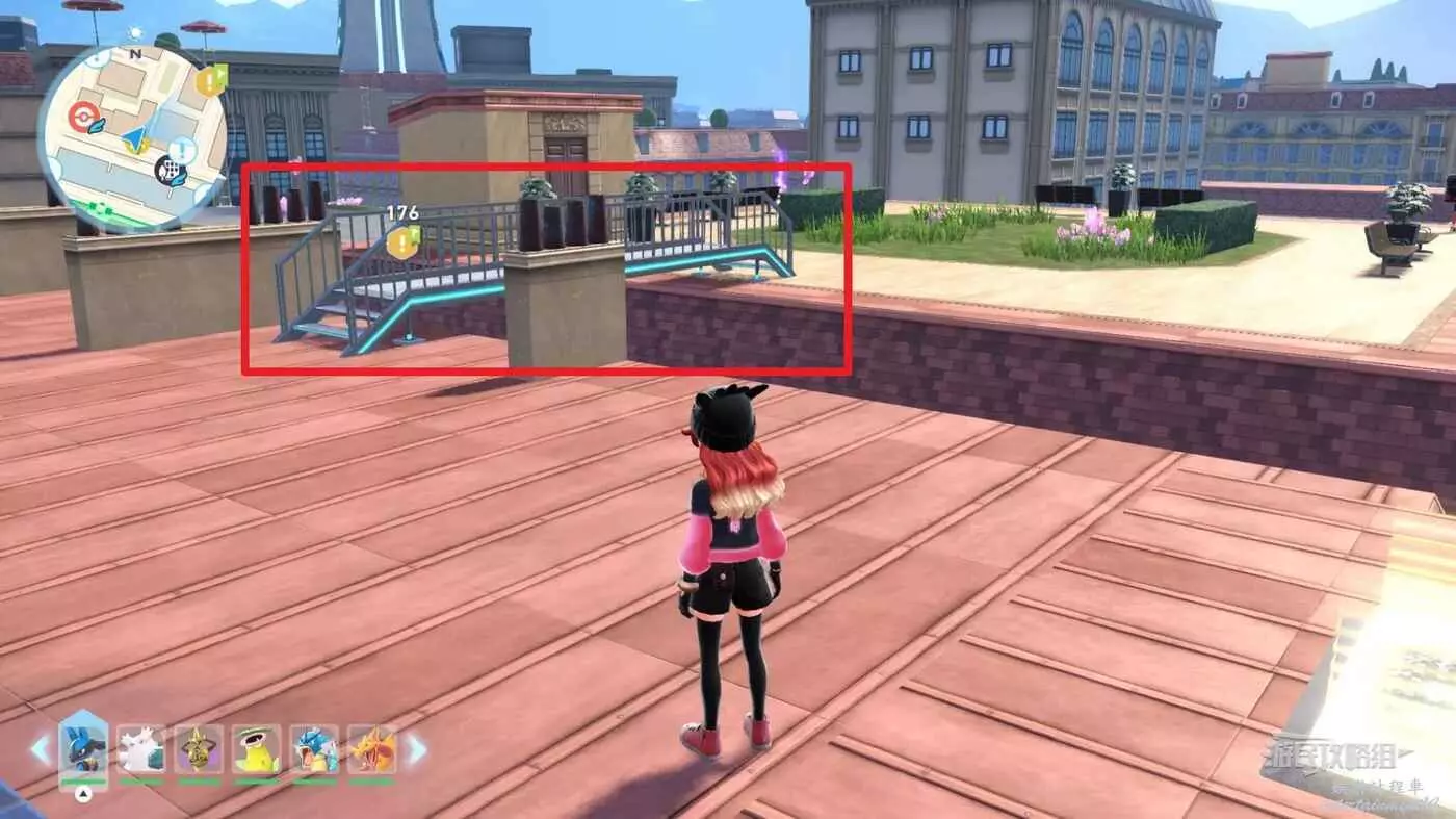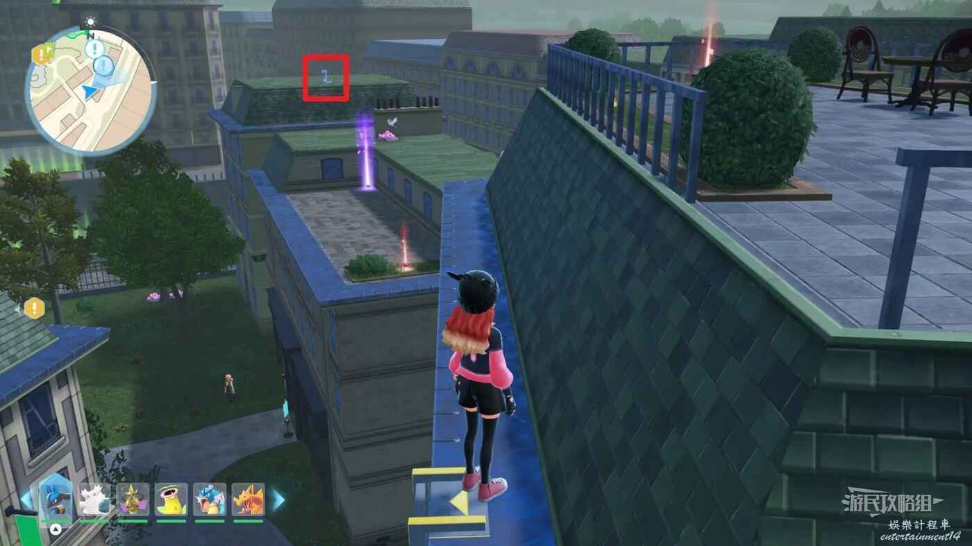 需要使用傳送梯到達房頂,然後打碎超級晶石過橋到對面房頂並左轉,使用洛托姆滑翔到達對面房頂爬梯子,繼續打開並走蜘蛛網到對面房頂,往左看就能看到迷你龍,附近有很多長椅。