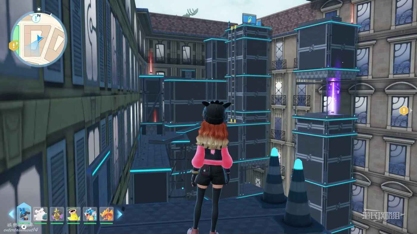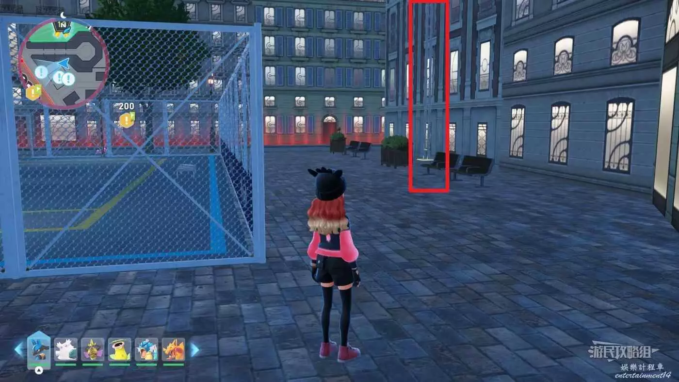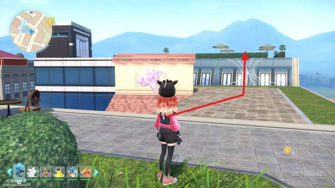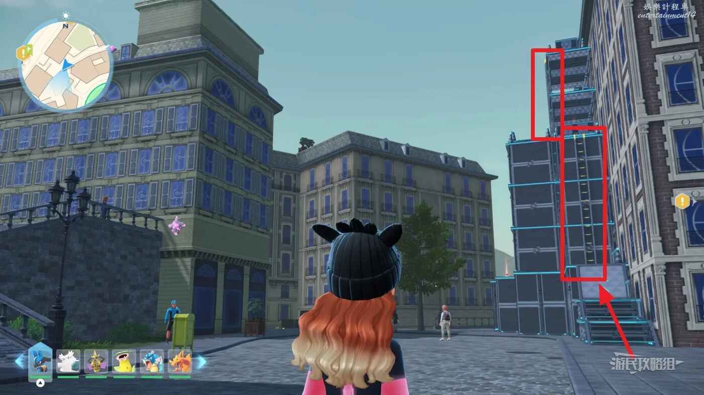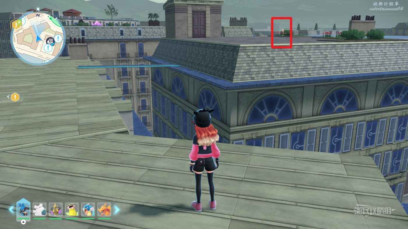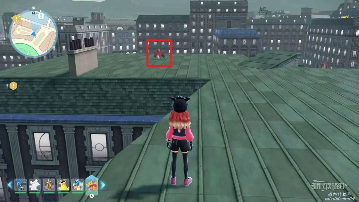 需要使用傳送梯到達房頂,然後打碎超級晶石過橋到對面房頂並左轉,使用洛托姆滑翔到達對面房頂爬梯子,繼續打開並走蜘蛛網到對面房頂,往左看就能看到迷你龍,附近有很多長椅。