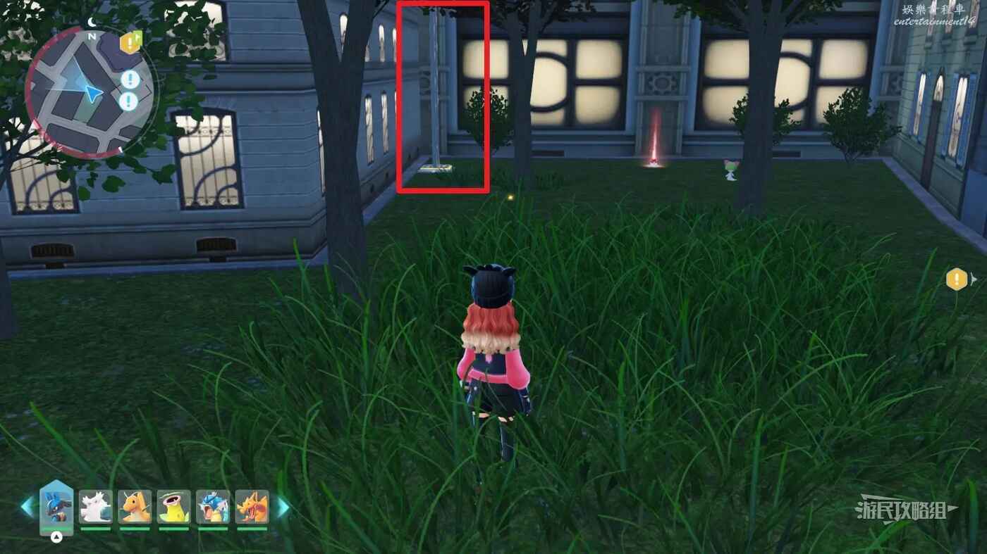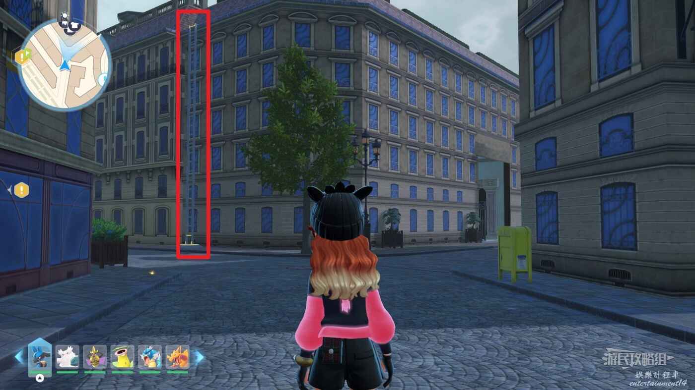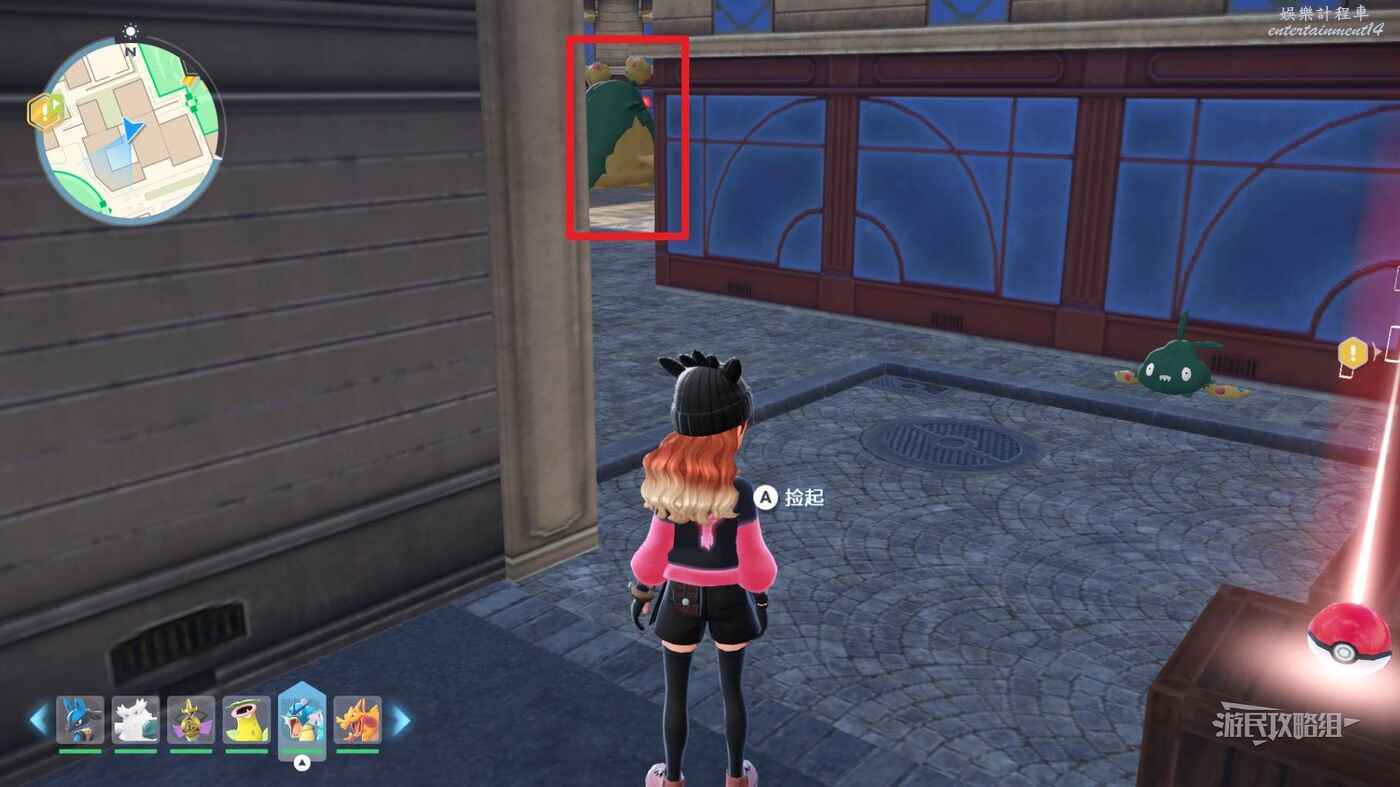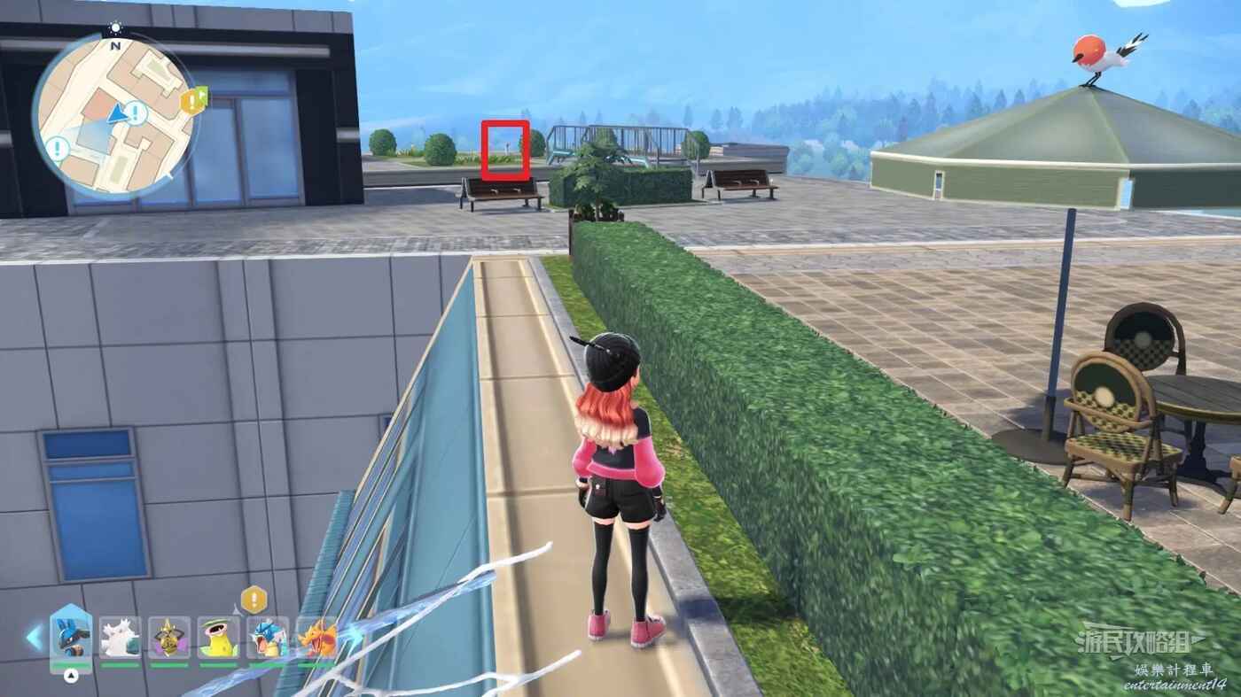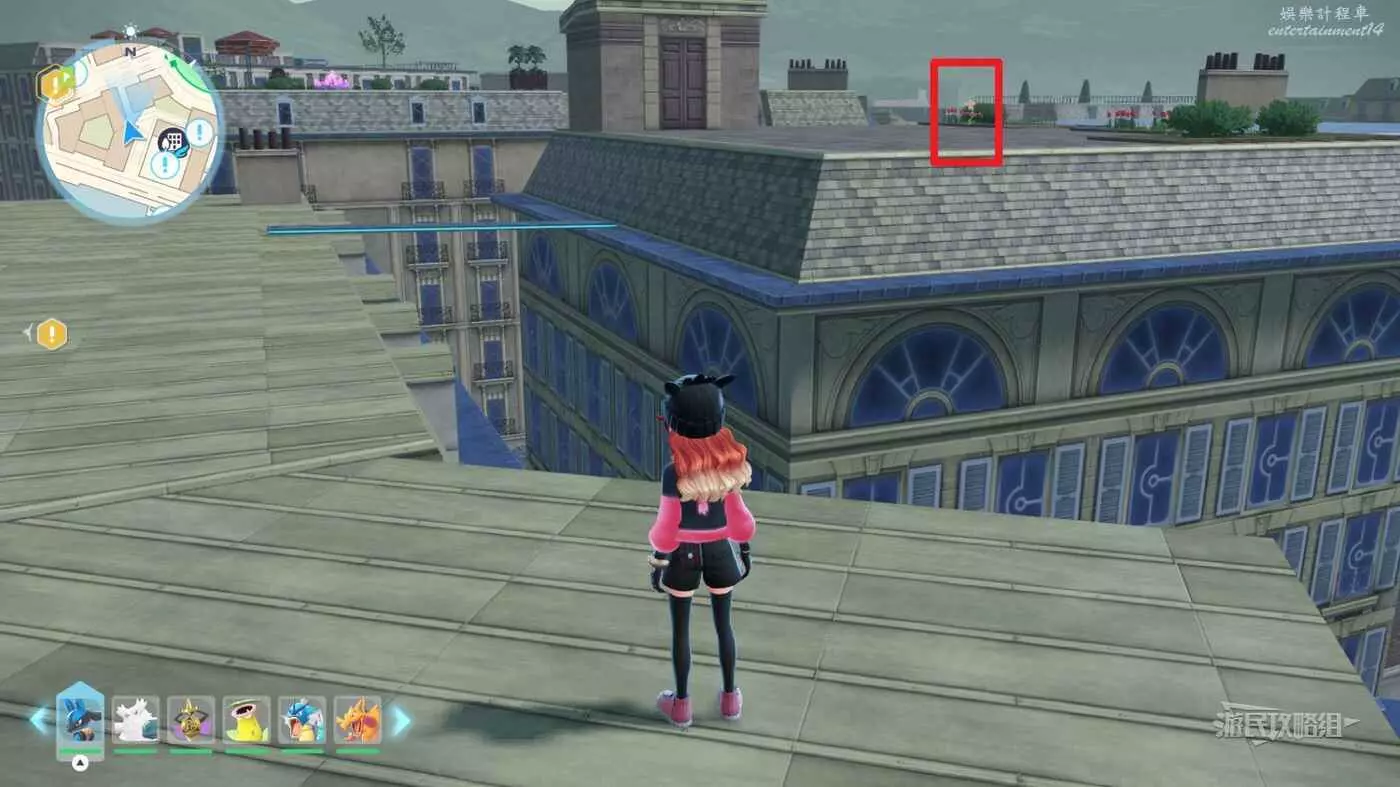 需要使用傳送梯到達房頂,然後打碎超級晶石過橋到對面房頂並左轉,使用洛托姆滑翔到達對面房頂爬梯子,繼續打開並走蜘蛛網到對面房頂,往左看就能看到迷你龍,附近有很多長椅。