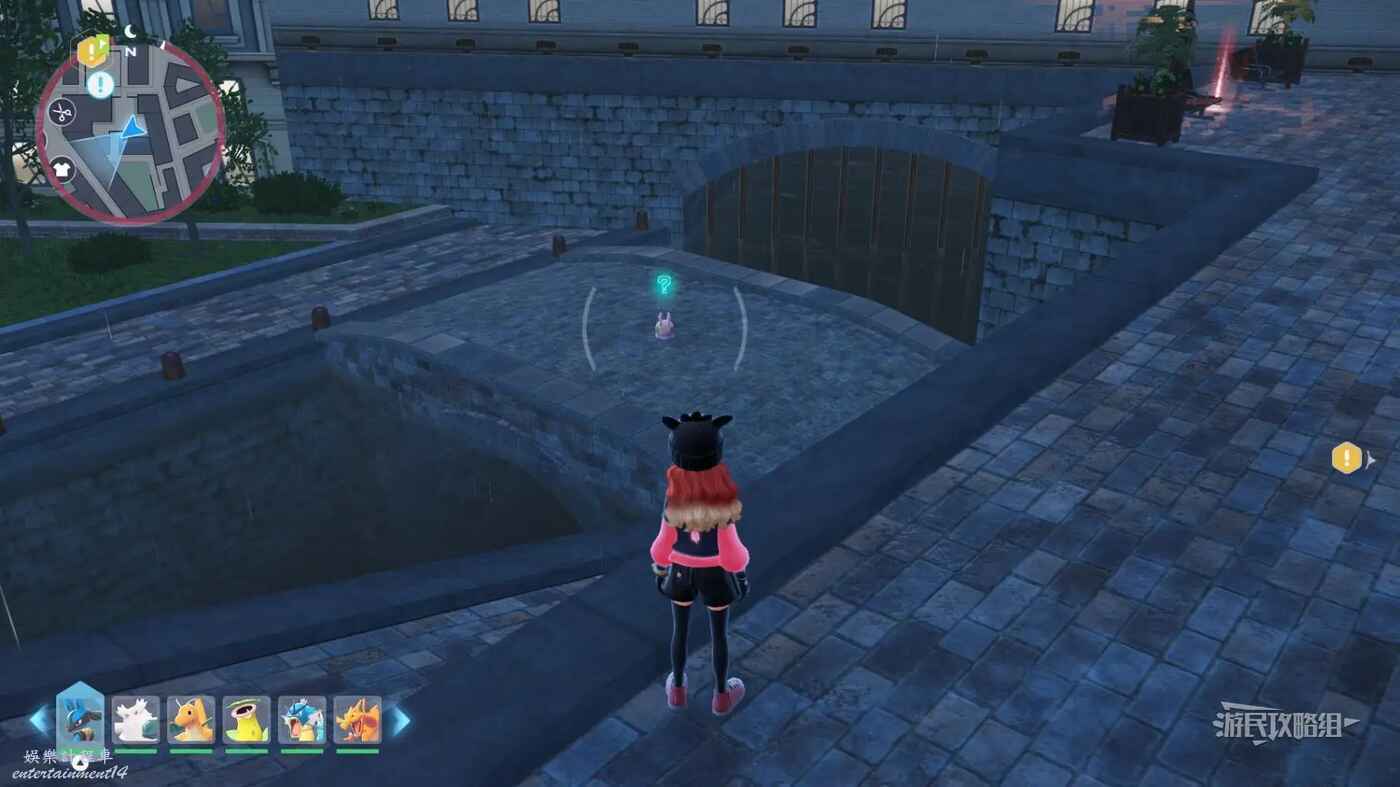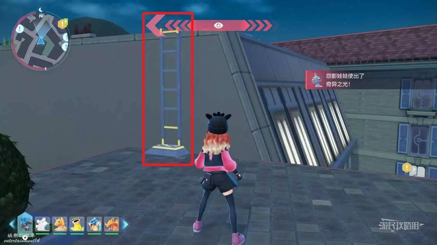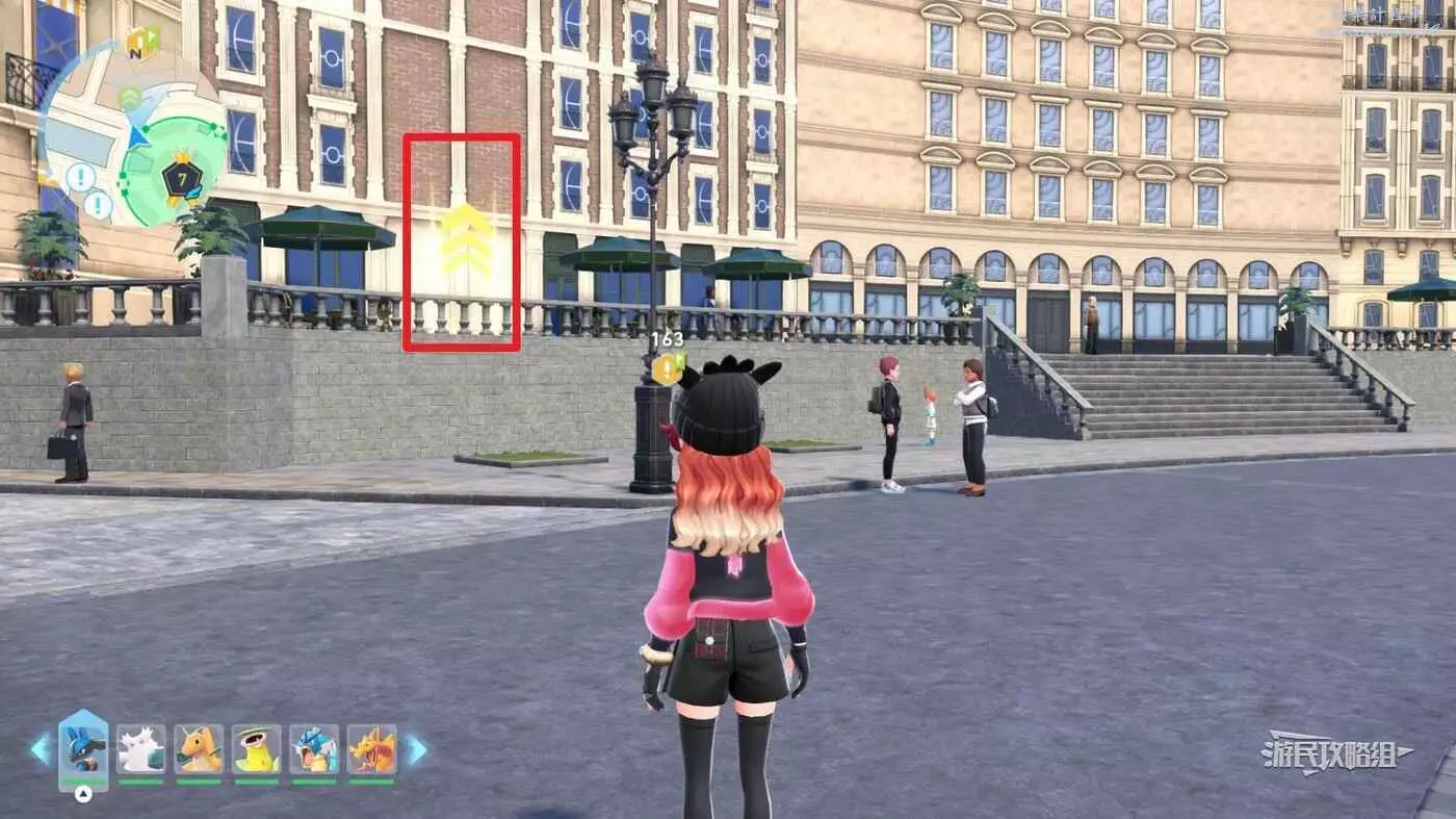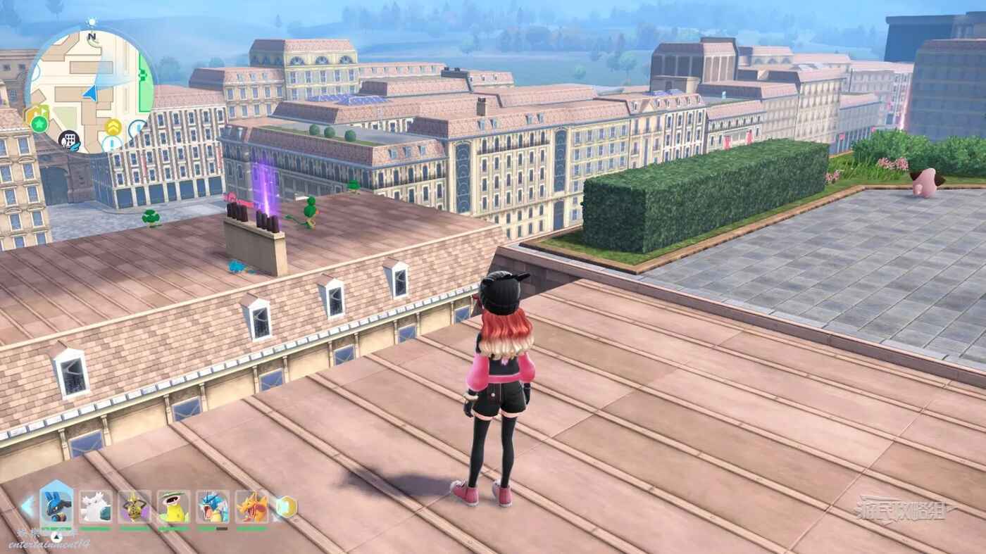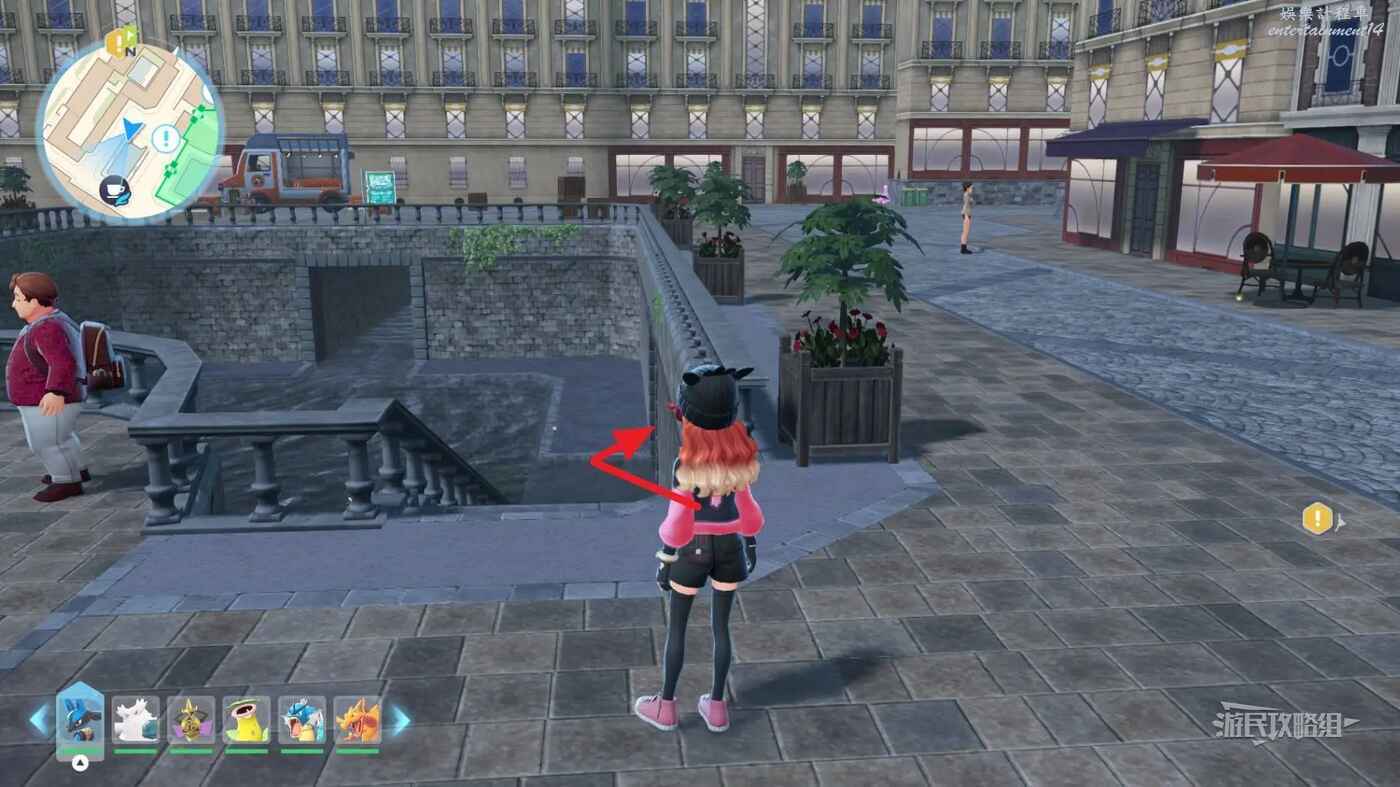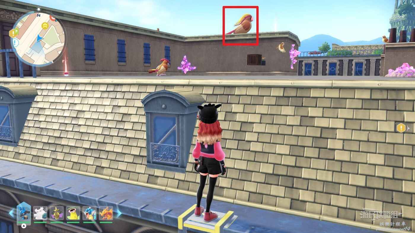 需要使用傳送梯到達房頂,然後打碎超級晶石過橋到對面房頂並左轉,使用洛托姆滑翔到達對面房頂爬梯子,繼續打開並走蜘蛛網到對面房頂,往左看就能看到迷你龍,附近有很多長椅。