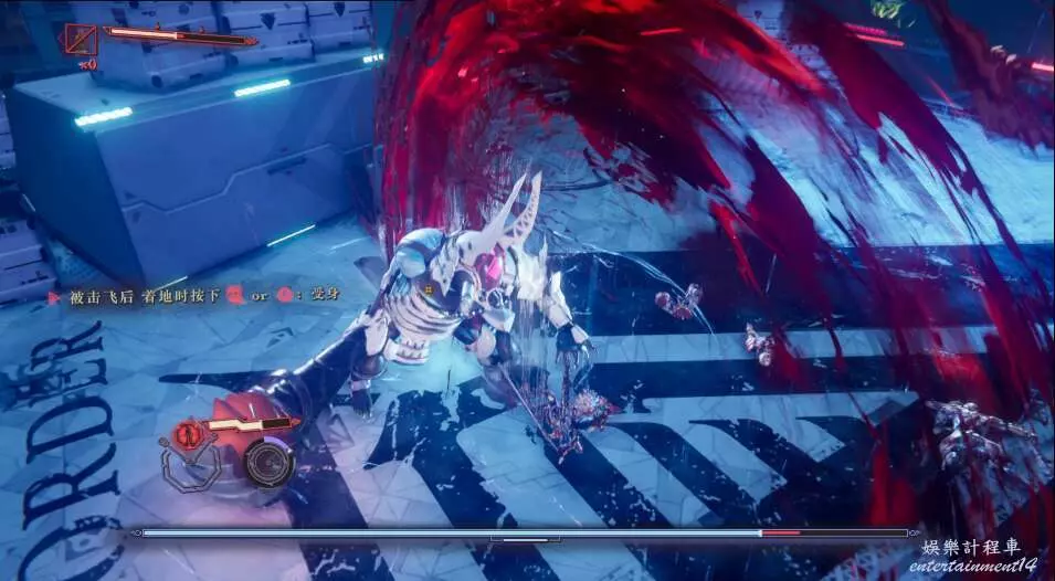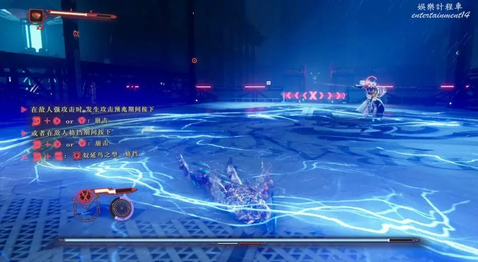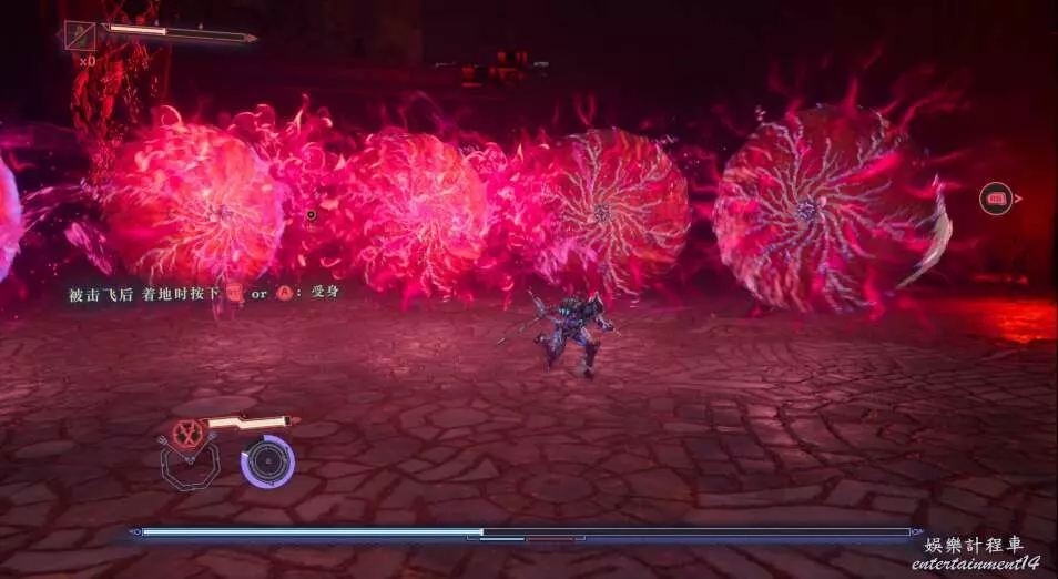 這個boss會使用頻繁的範圍攻擊,建議使用格擋先抵擋前面幾招,最後一招再使用閃避。