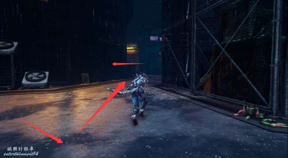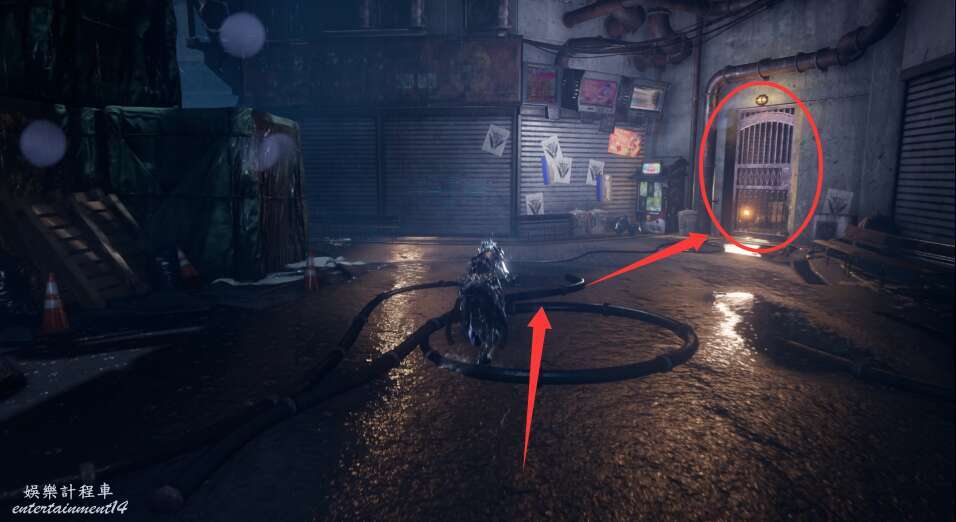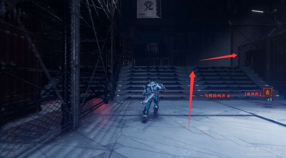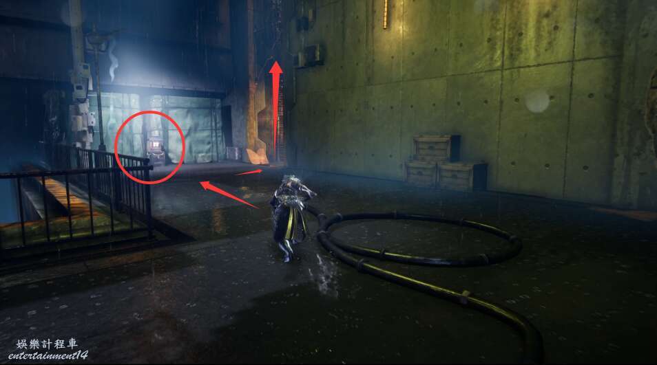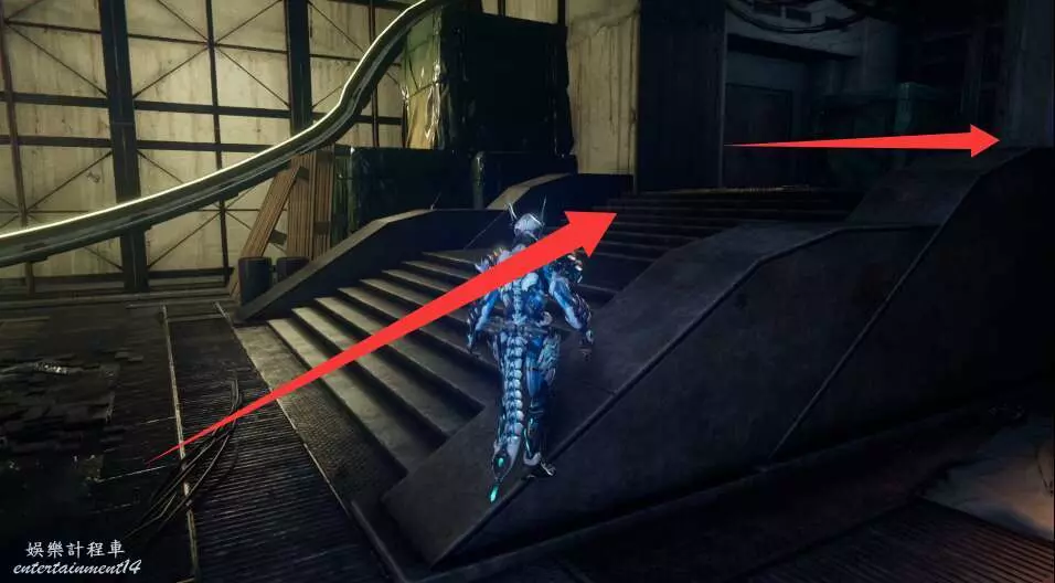 離開發電機,向著右前方上樓梯進入鐵門。