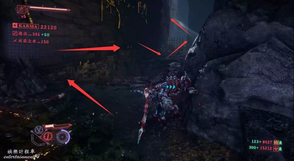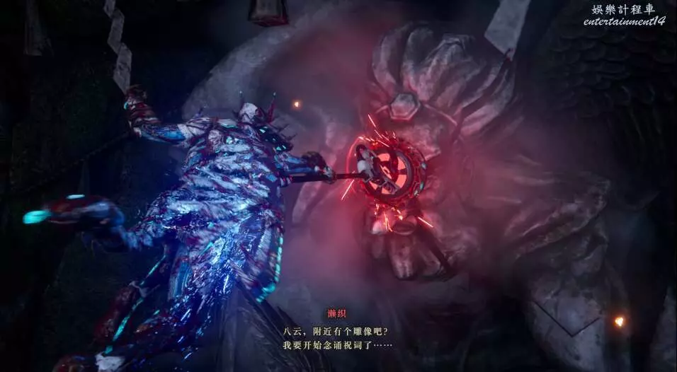 在這雕像之前,擁有大量的敵人,我們儘量用魔鑽追擊飛天敵人,然後用雙刀擊殺地面強敵,頻繁使用強化形態可以有效破除敵方霸體。