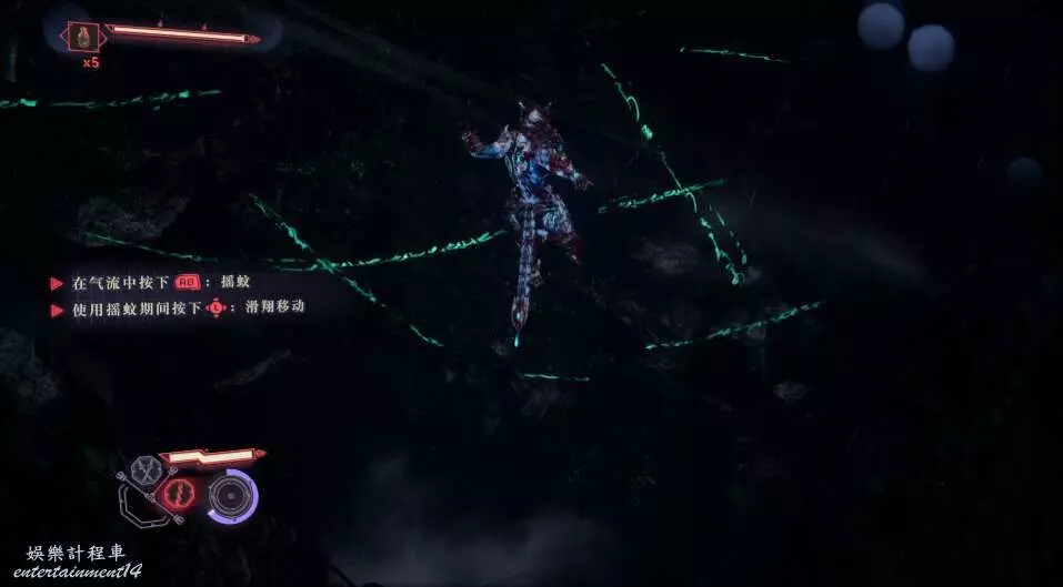 山神在攻擊途中會飛翔然後繞場幾圈再俯衝襲來,我們可以操縱角色在場地環境中的風場飛行躲避攻擊。