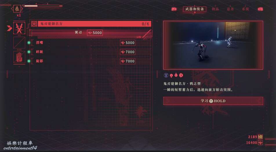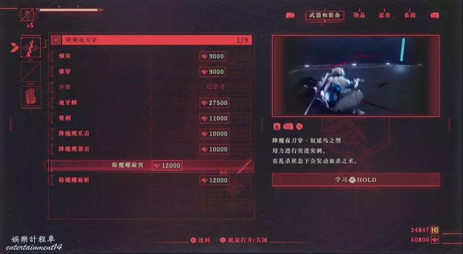 可以在烏鴉處進行體力學習,而武器學習這邊建議優先學習降魔夜刀穿的武器技能。