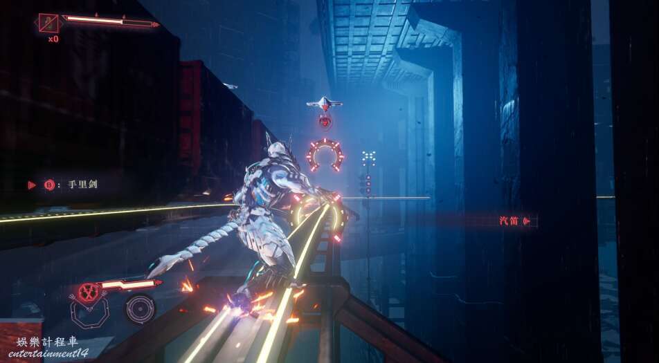 在前方利用手裡劍可以攻擊準備下放障礙物的飛行器。