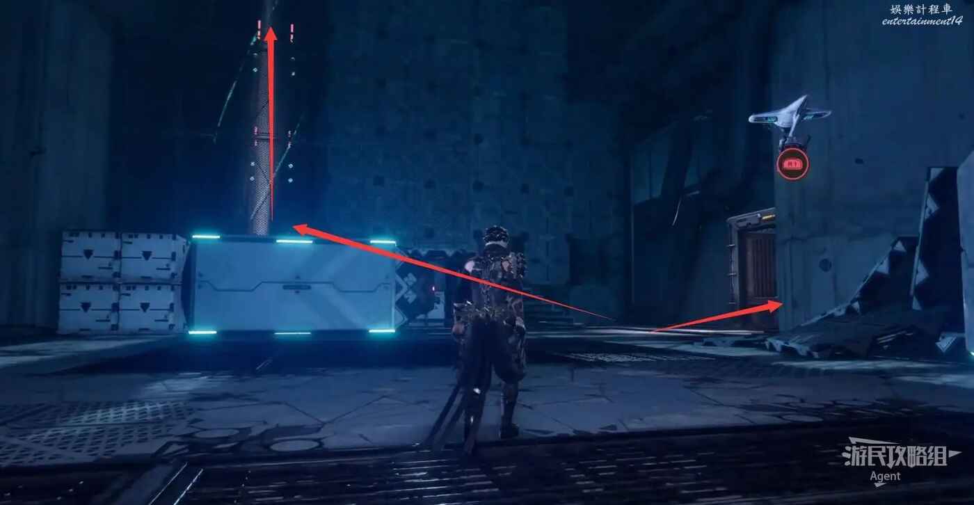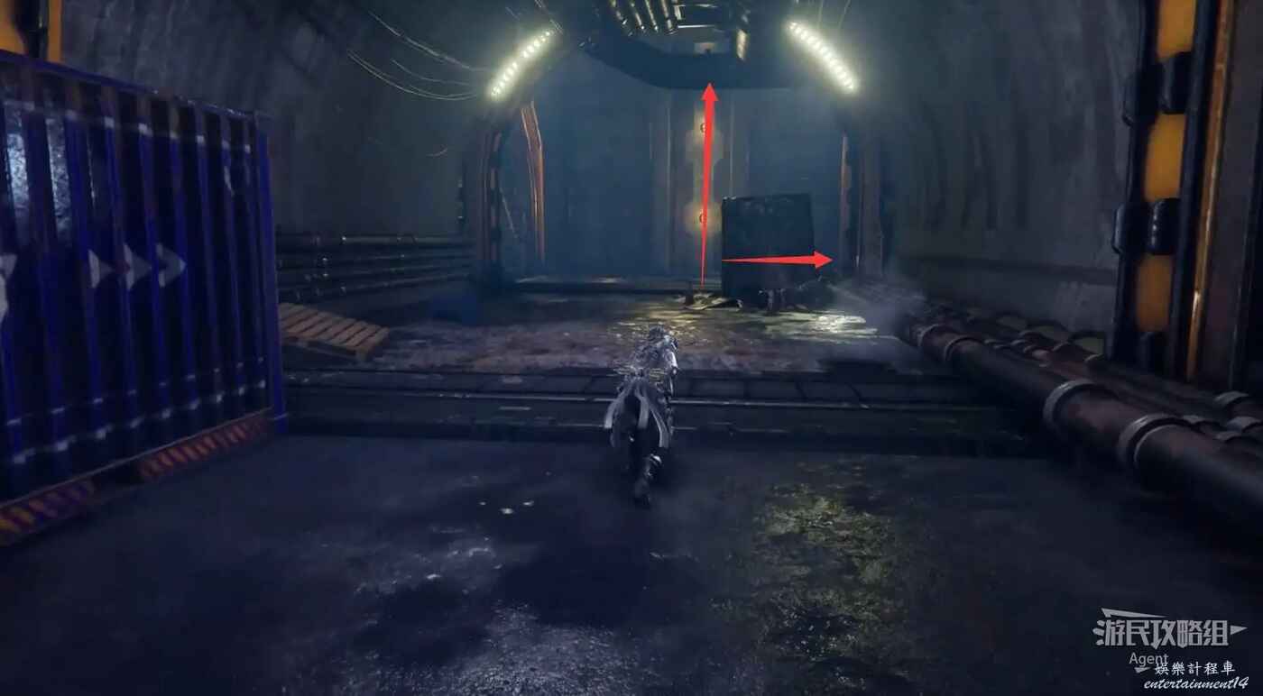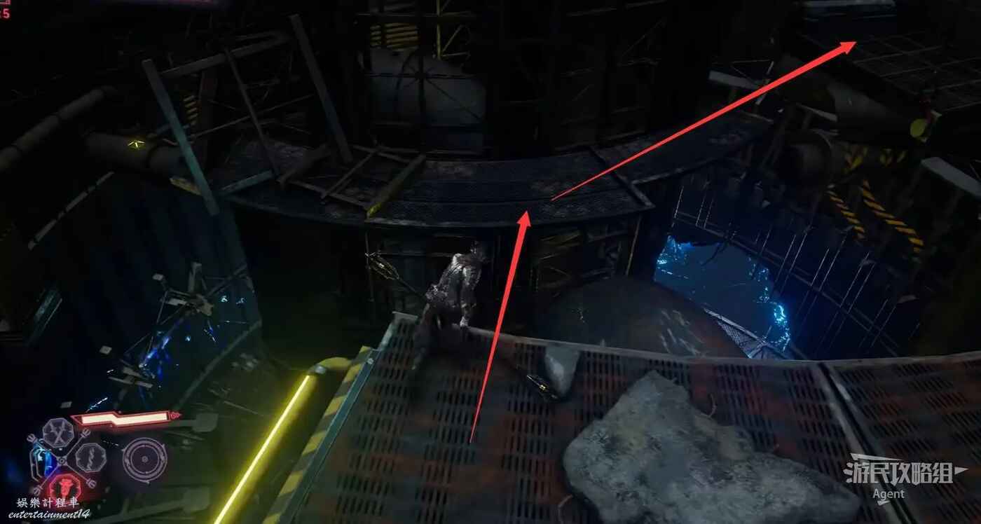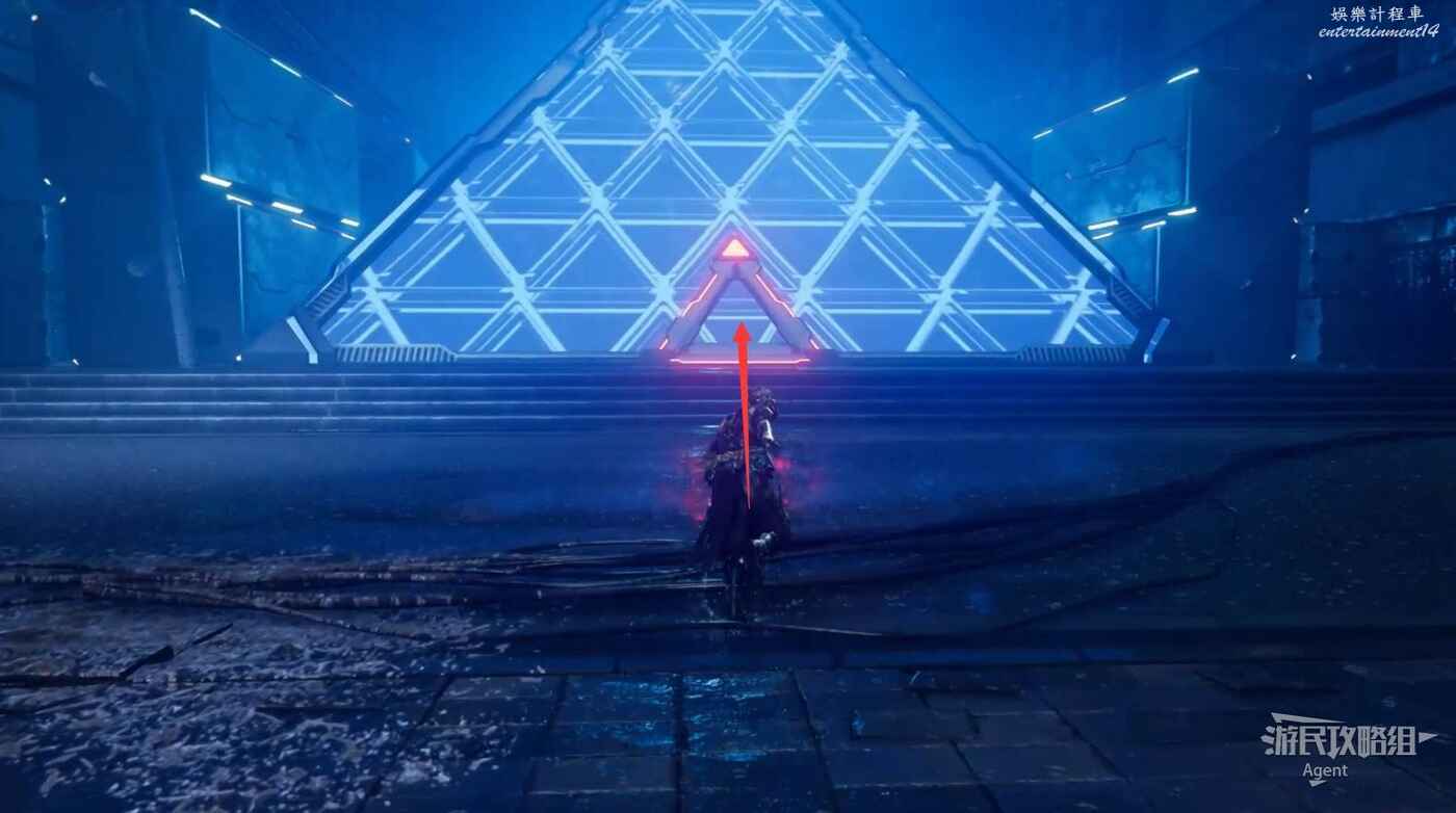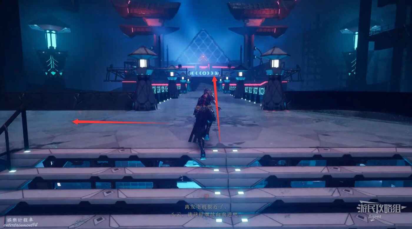 乘電梯上來,出去右邊有個寶箱,然後滑過軌道,消滅敵人後進入金字塔破壞發電機。
