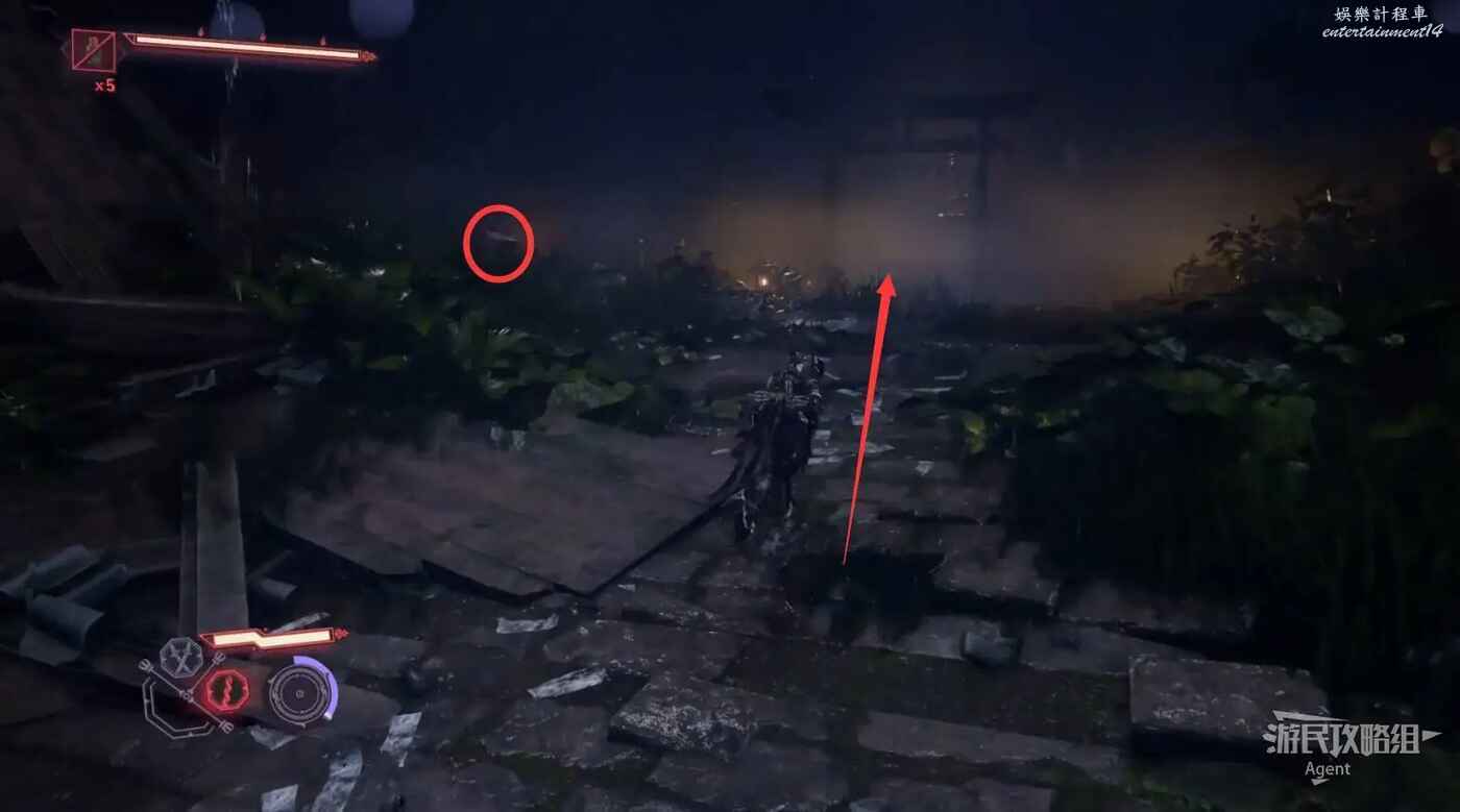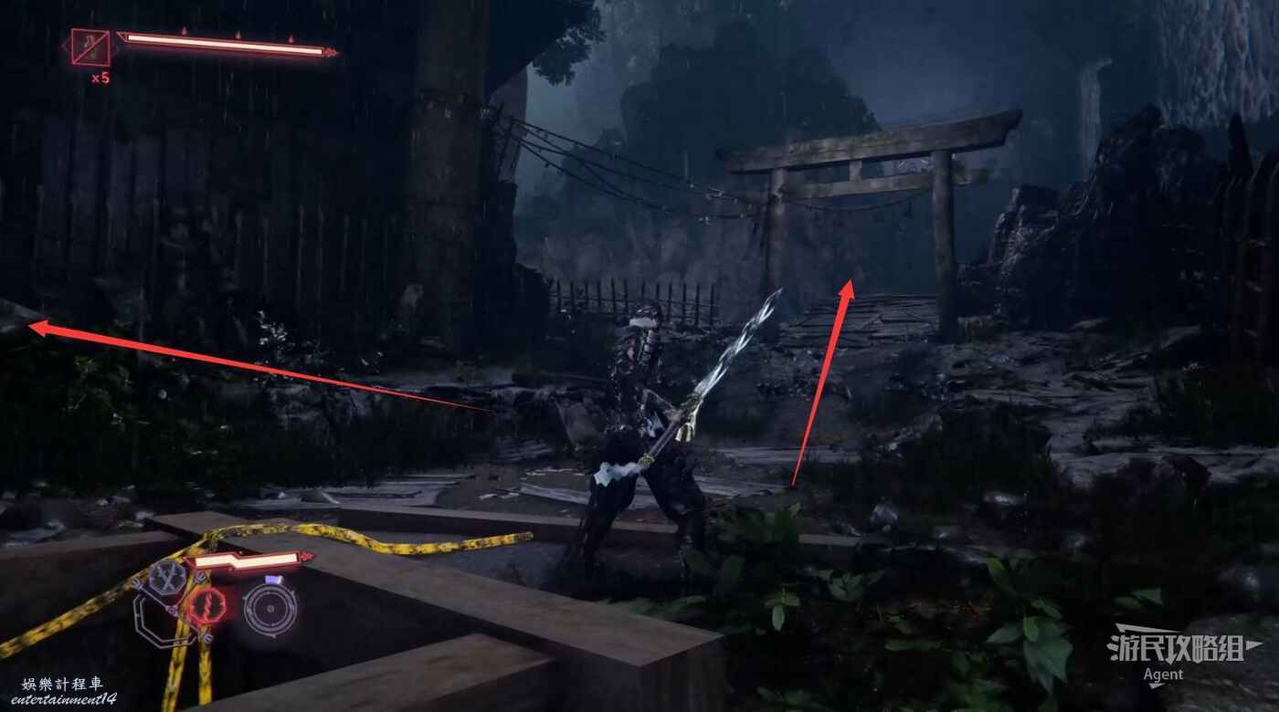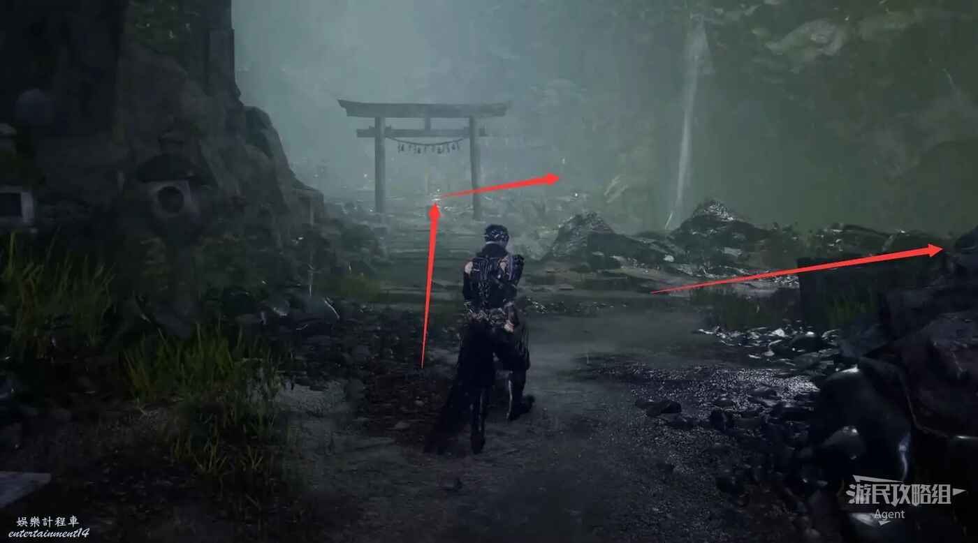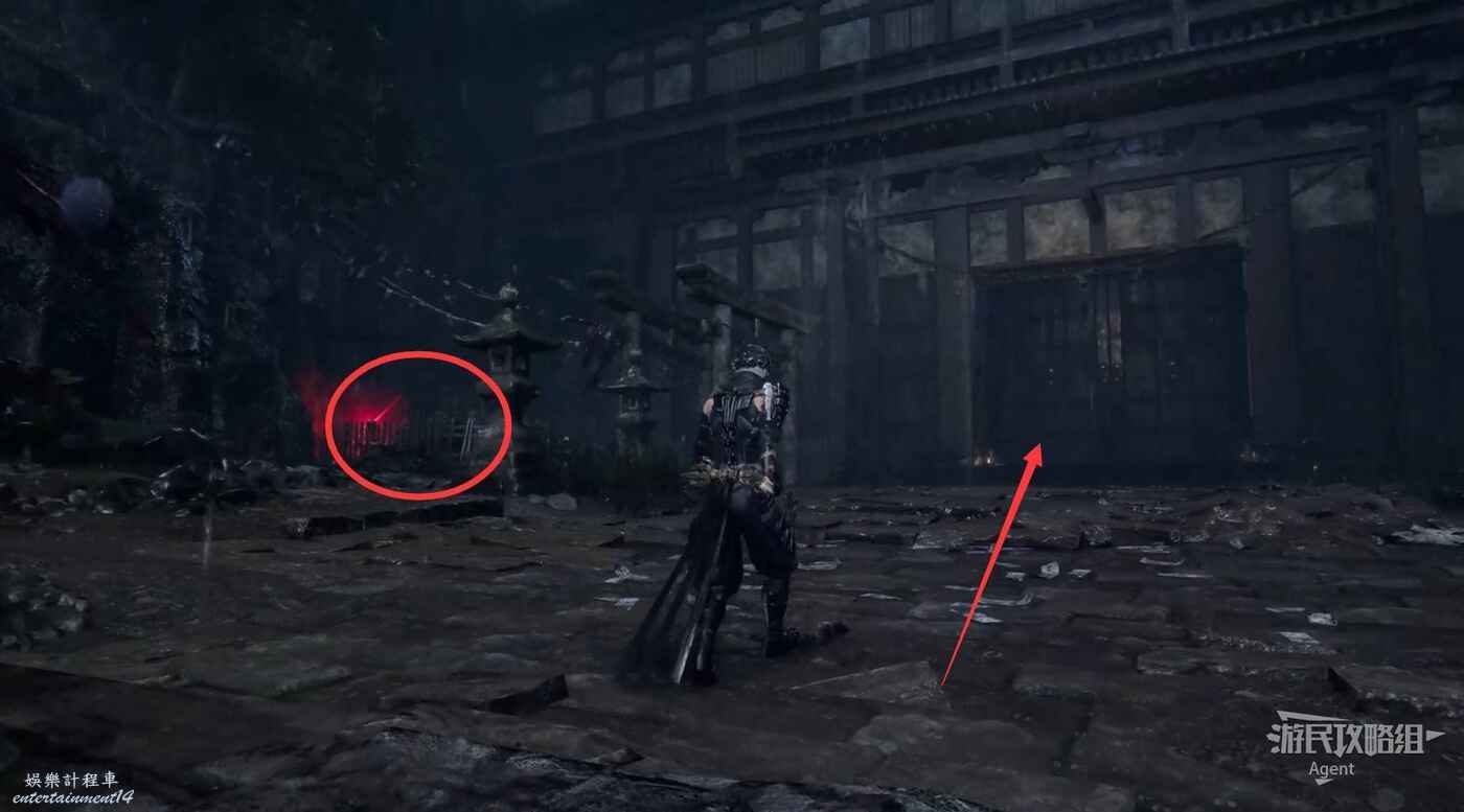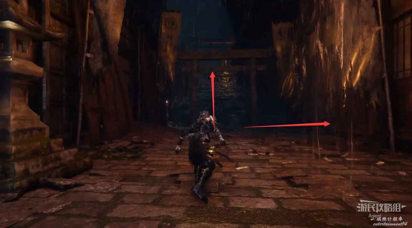 前方院子有敵人先不管,等下探索完右邊岔路自然會到那裡。