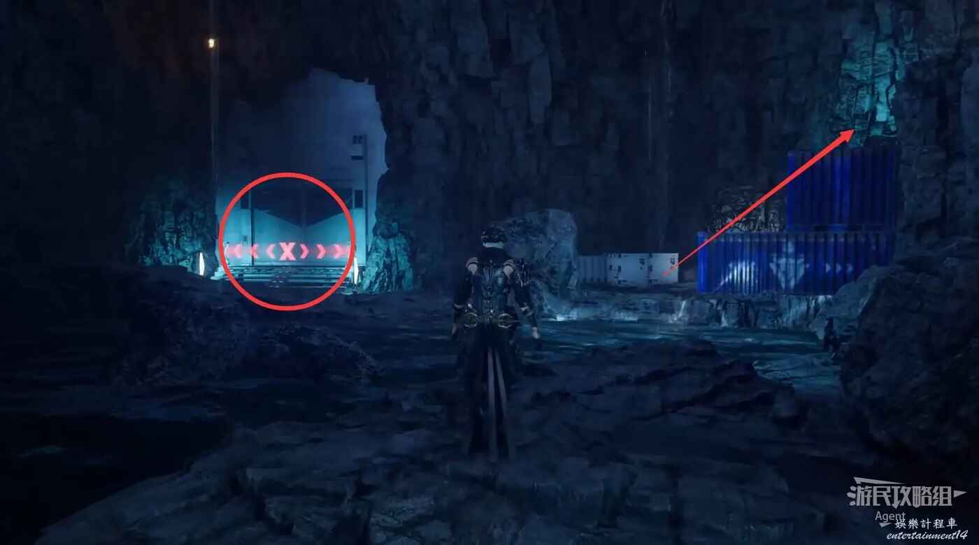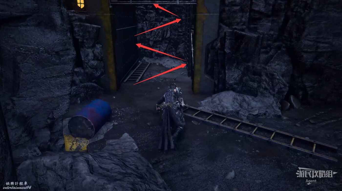 洞裡的門打不開,從旁邊集裝箱後面的路往上跳。可以走的路和牆都有黃色標記。
