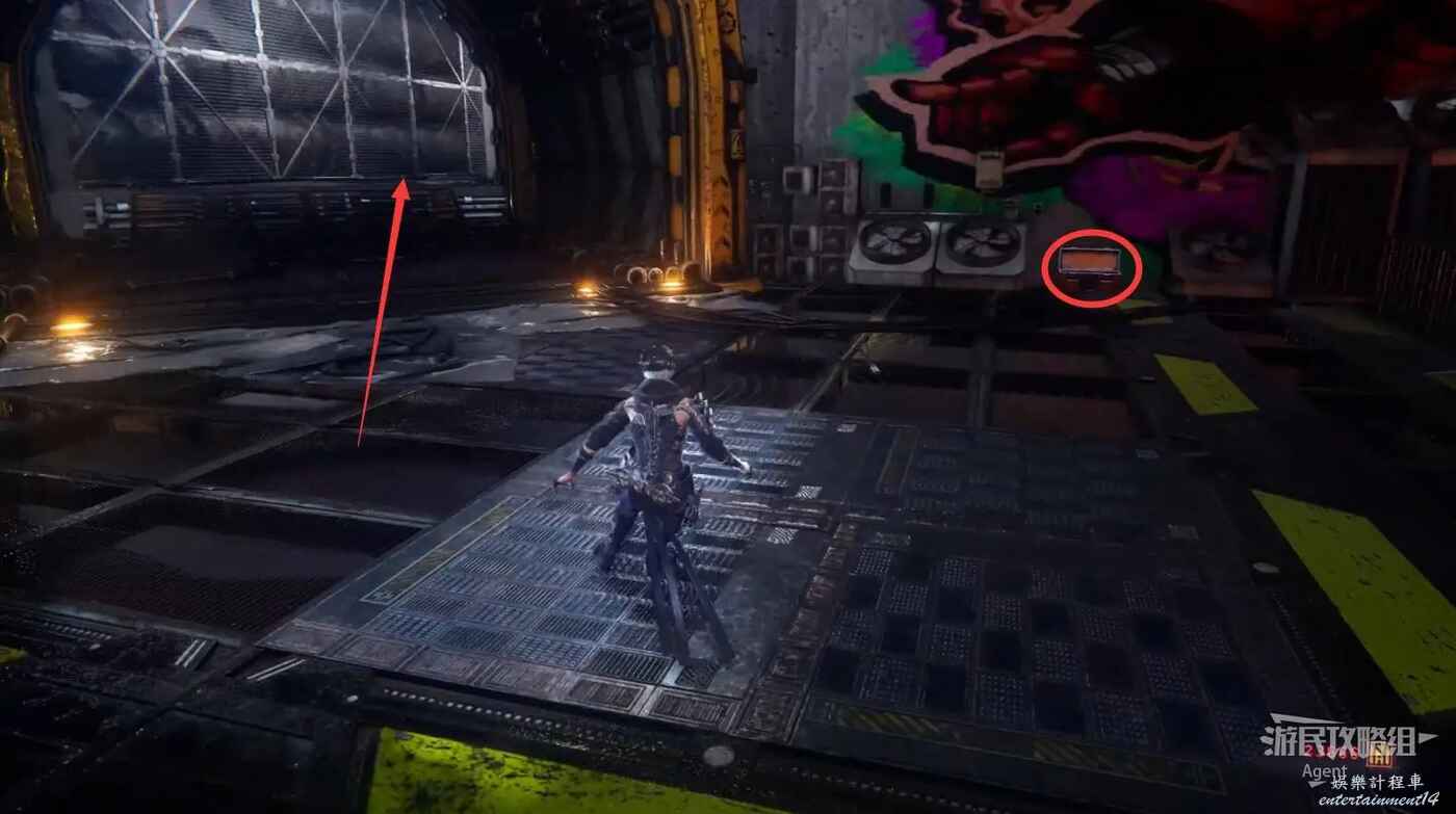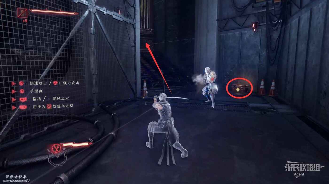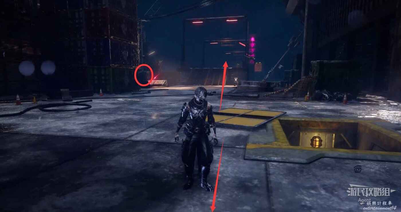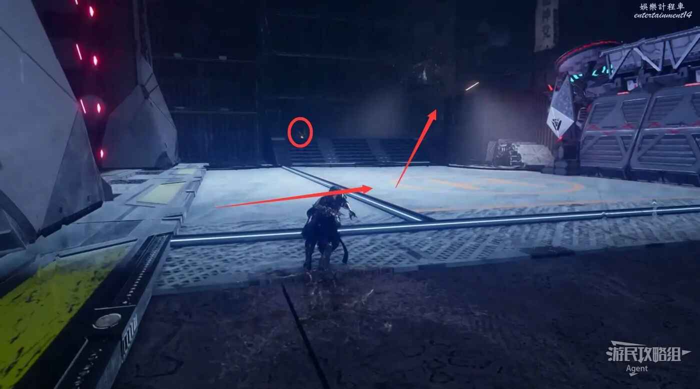 消滅敵人後大門打開,走過門看右邊集裝箱頂部有個寶箱,然後終端旁階梯上有個寶箱。